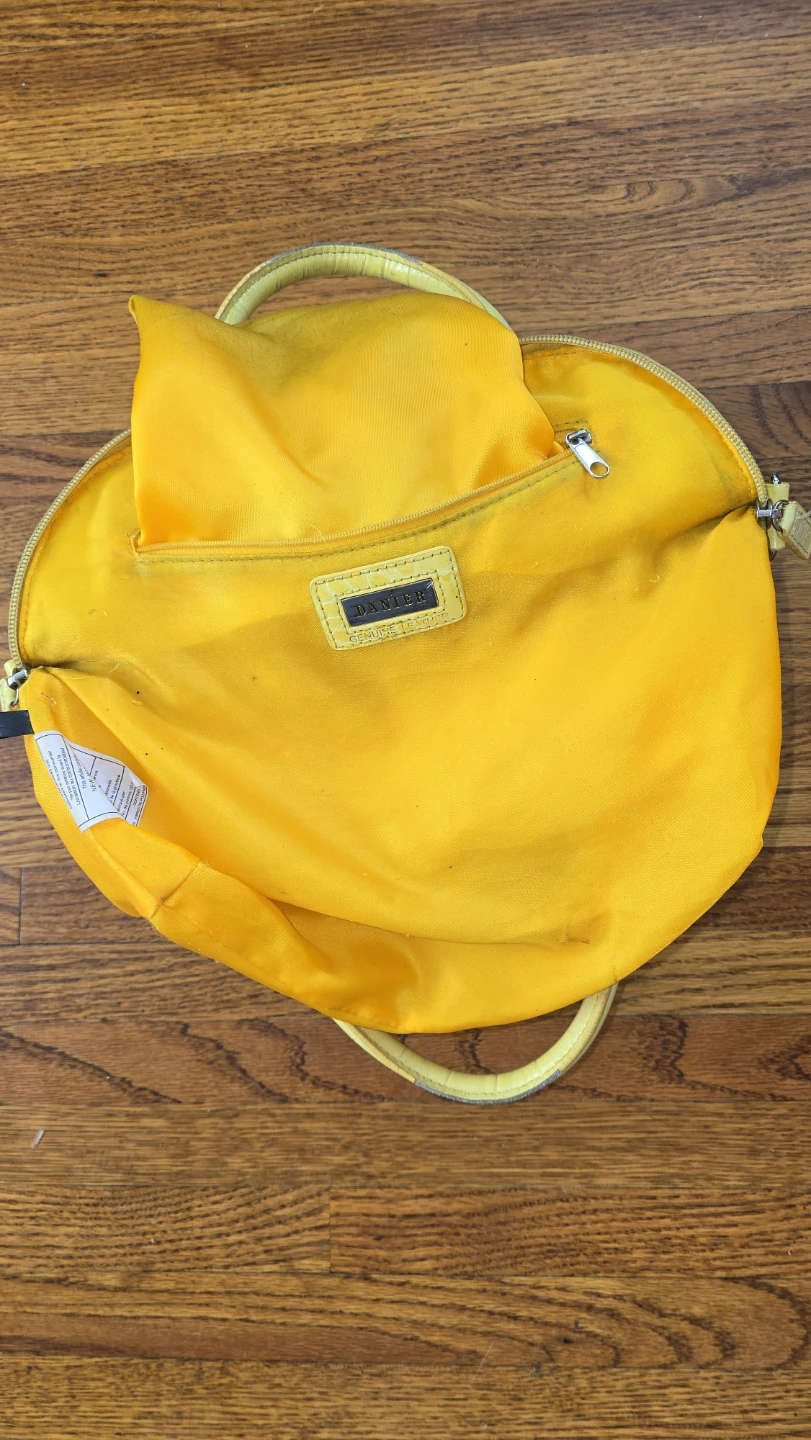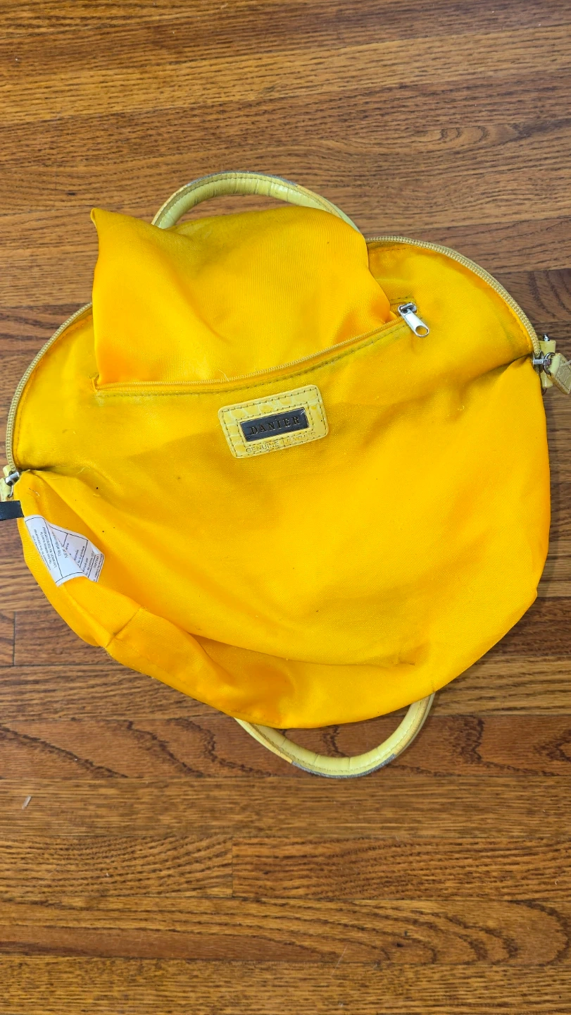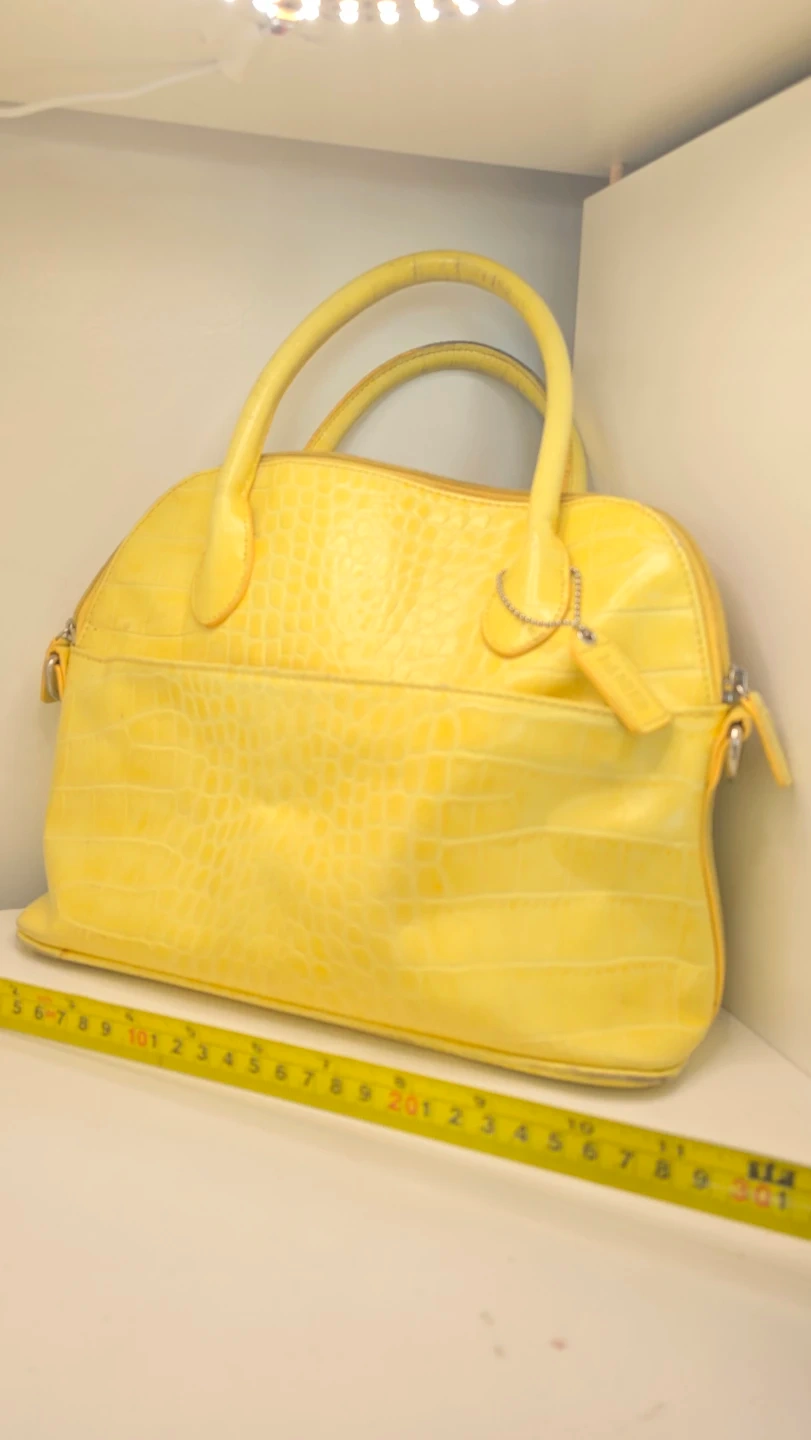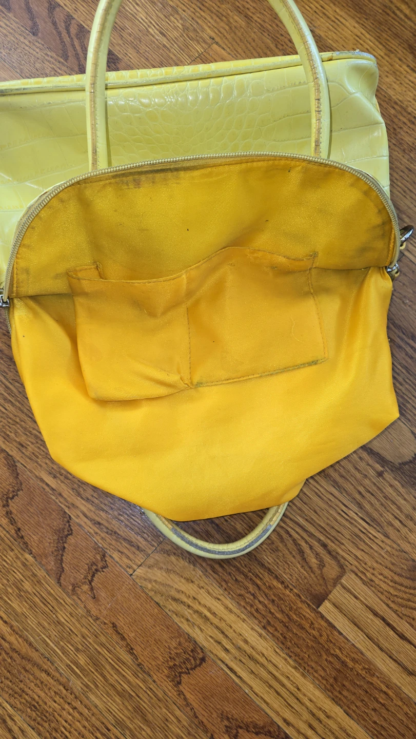 Selling a Danier yellow leather purse. It's a stylish and functional bag perfect for everyday use. The purse has a unique crocodile-like texture and a spacious interior with multiple pockets for organization