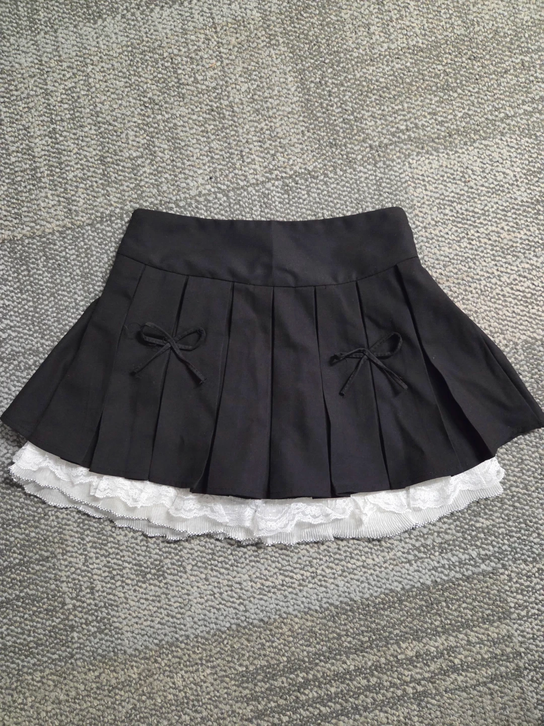 Cute black pleated mini skirt with a lace trim at the bottom. The skirt is made of 95% polyester and 5% spandex. Brought off Taobao, worn twice. Size 2. There are built in safety shorts.