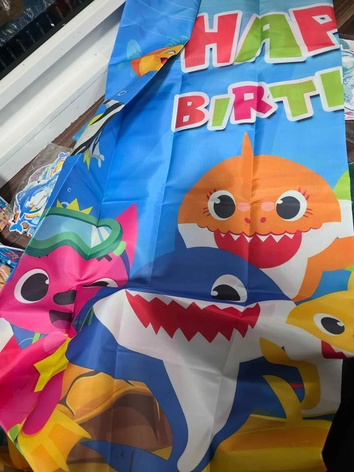 Two large Happy Birthday Canvas backdrops (approx size 2feet by 5 feet), happy birthday banner, under the sea hanging decor, two foil baby shark balloons, pink fog masks, under the sea masks, Birthday cake topper, and made up loot bags with extra bags. Everything you need for the party.