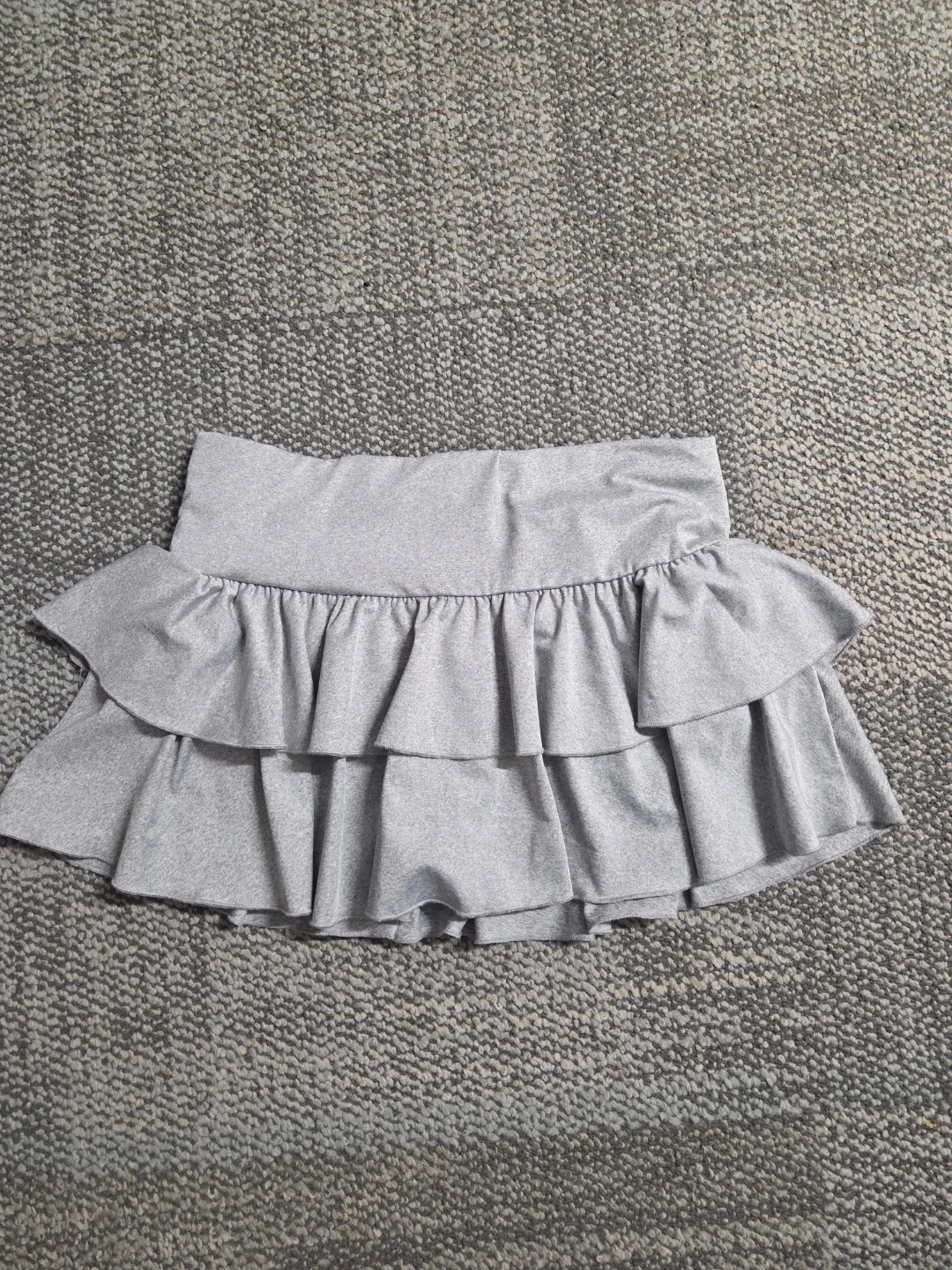 Selling a cute grey ruffled mini skirt. It's a size small and made of 91% polyester and 9% elastane. Brought off Shein, worn twice. There are built in safety shorts.