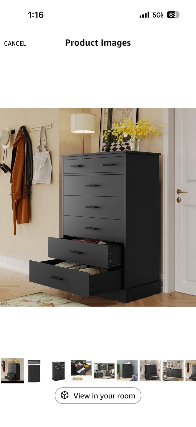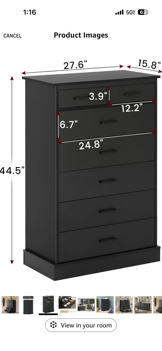 Selling a black chest of drawers! It measures 44.5 inches in height, 27.6 inches in width, and 15.8 inches in depth. It features six drawers, perfect for organizing your clothes and belongings