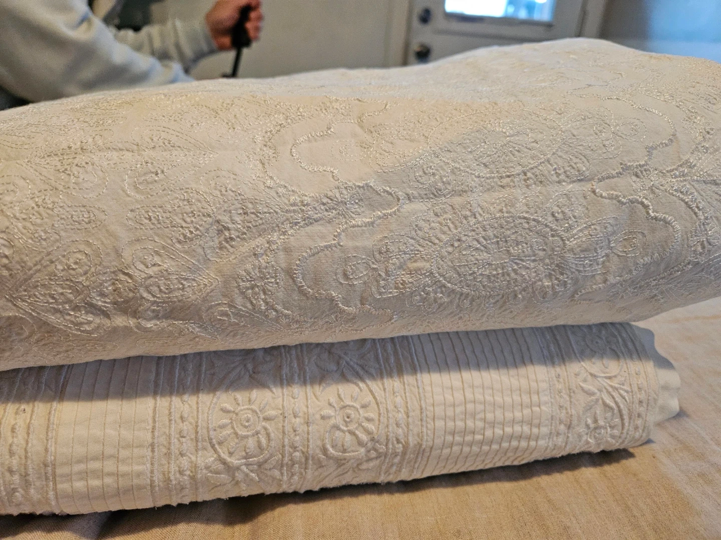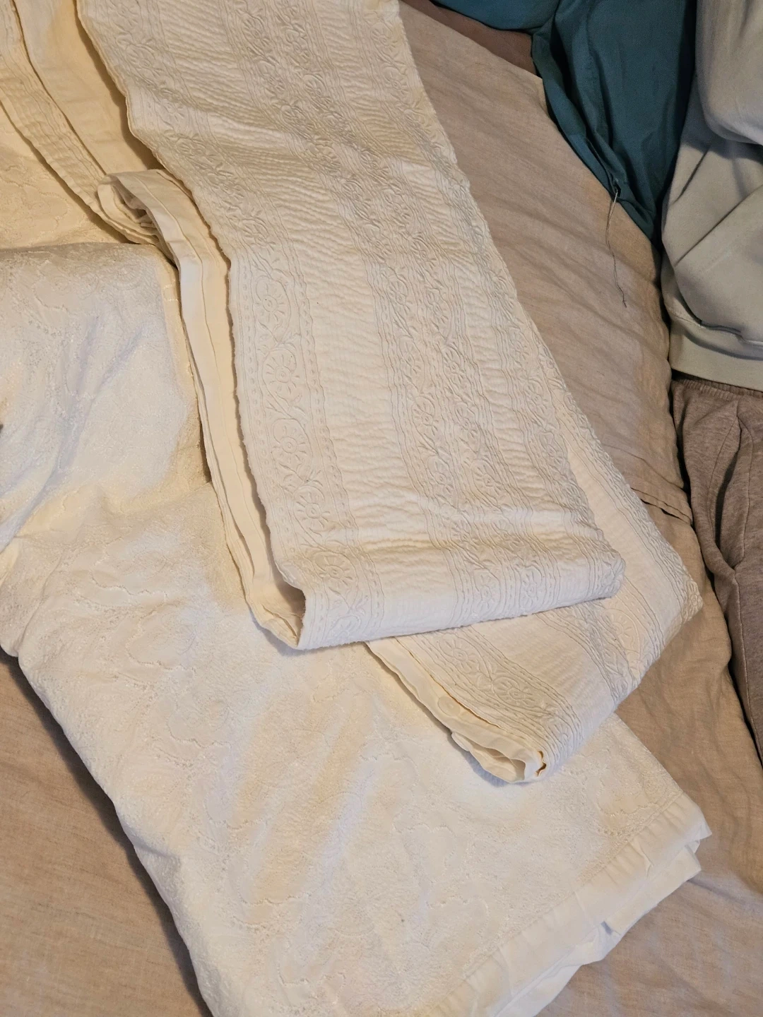 Selling a lovely white embroidered bedspread. The fabric has a beautiful textured pattern. It's in great condition and would add a touch of elegance to any bedroom