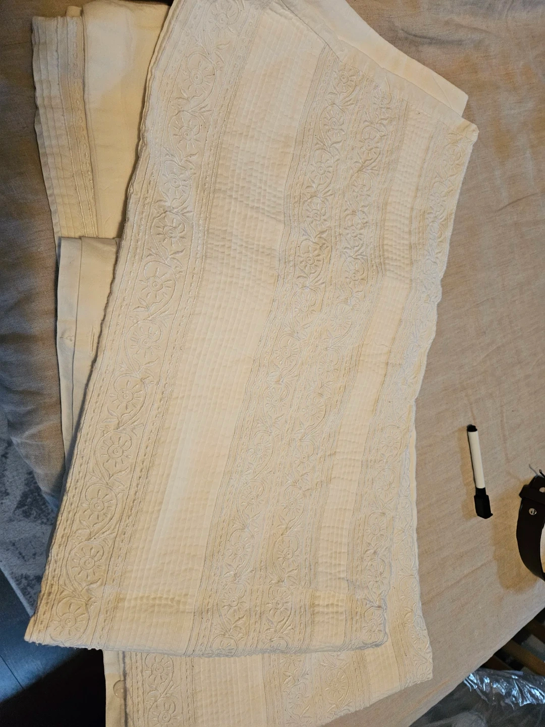 Selling a lovely white embroidered bedspread. The fabric has a beautiful textured pattern. It's in great condition and would add a touch of elegance to any bedroom