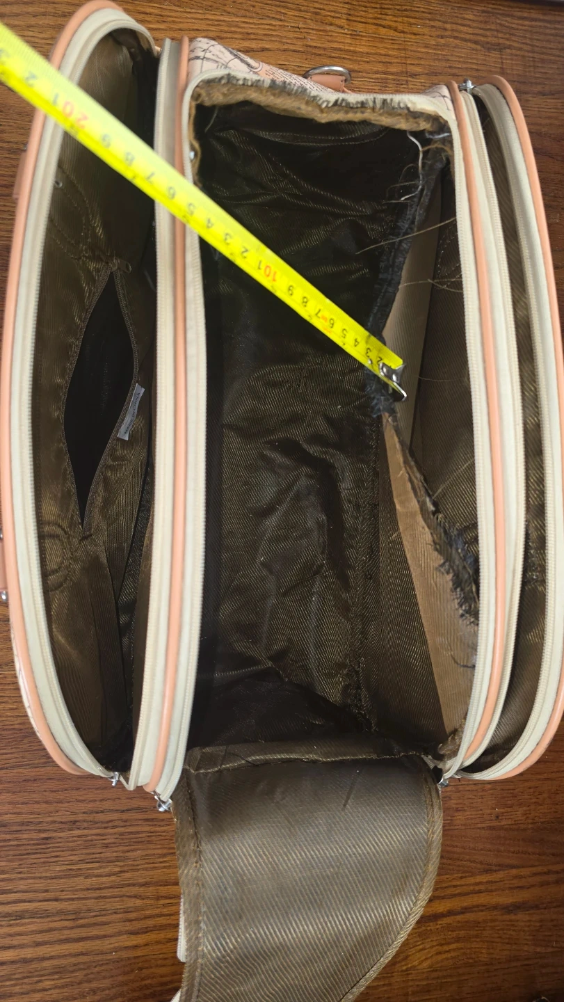 Via Vee World Classic bag with a map print. It has a unique design and is in good condition. It measures approximately 18 inches in length, 9 inches in width, and 12 inches in height.