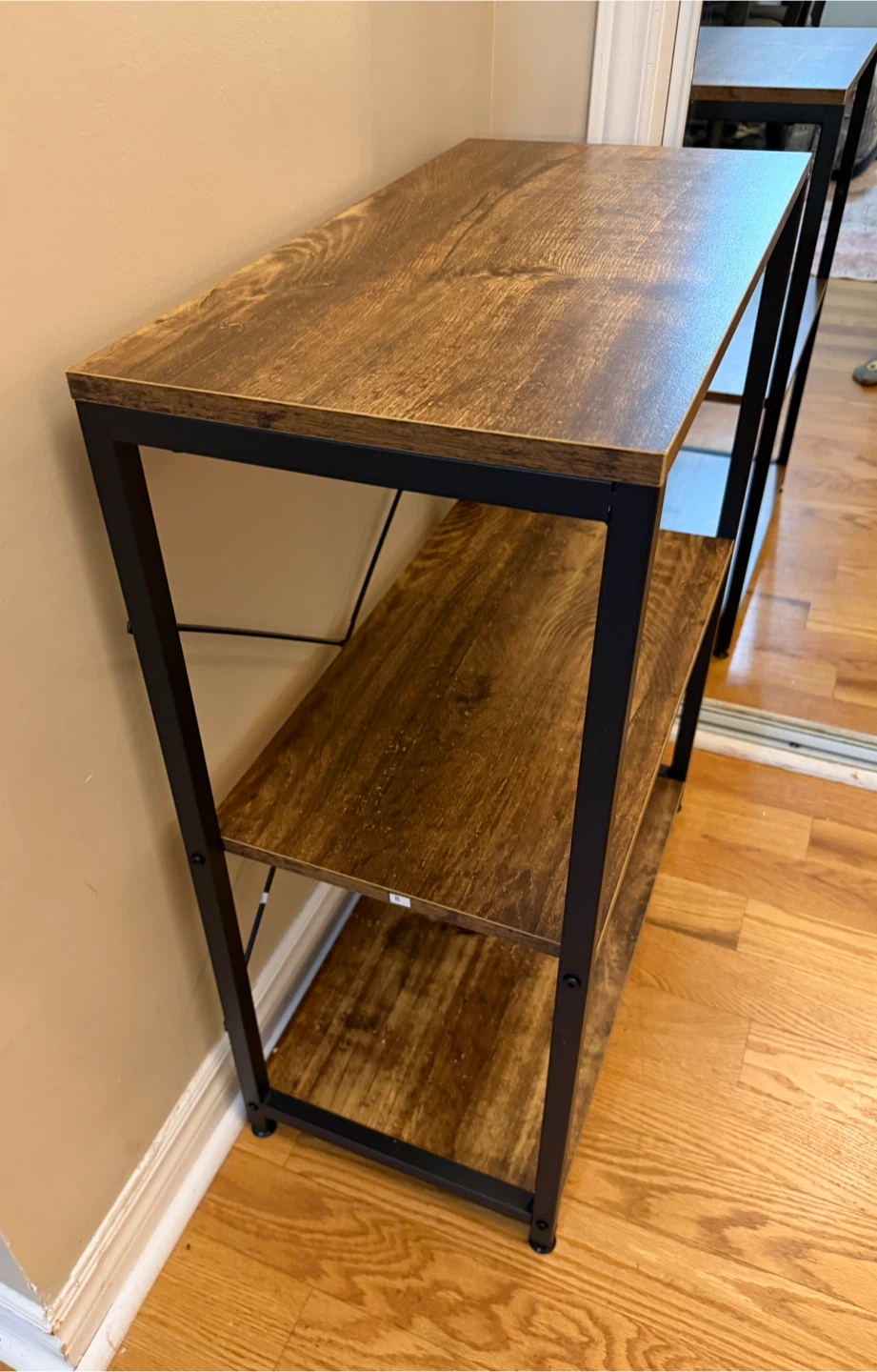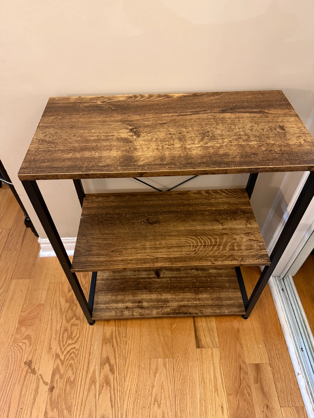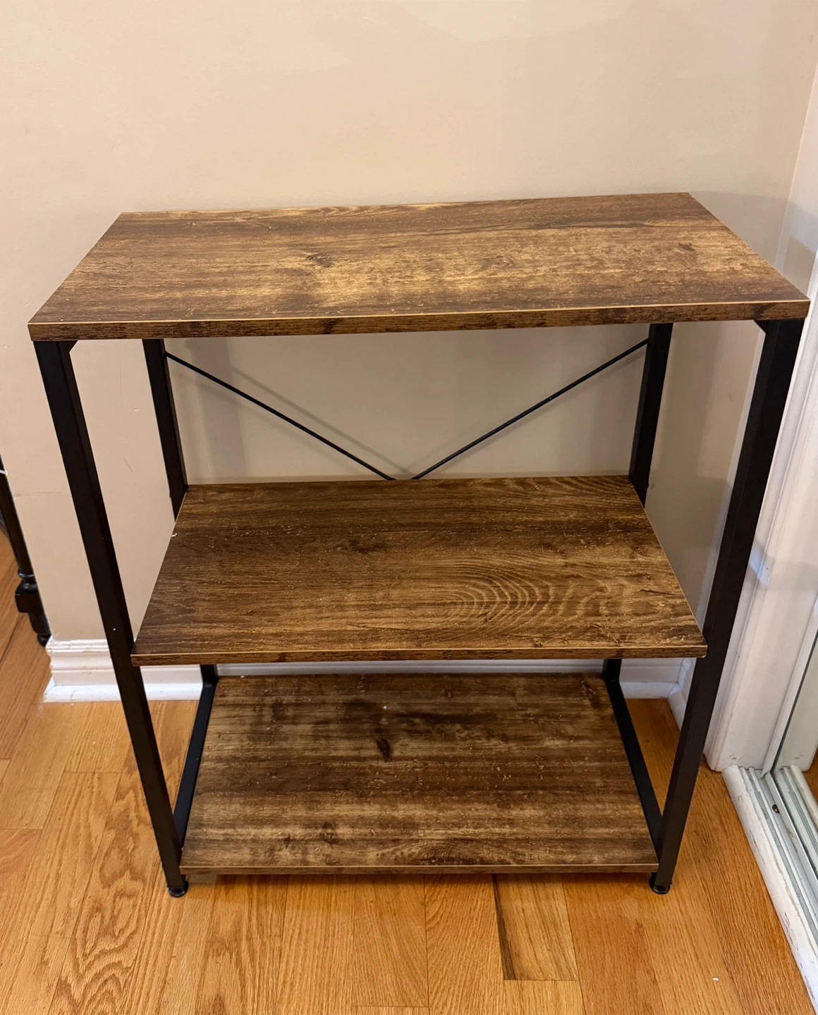Selling a 3-tier shelf with a brown wood finish and a sturdy black metal frame. It's in great shape and perfect for adding extra storage to any room!