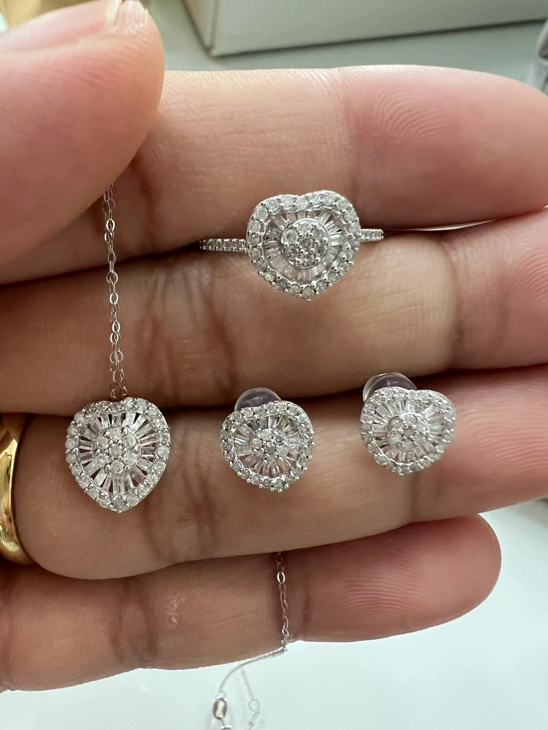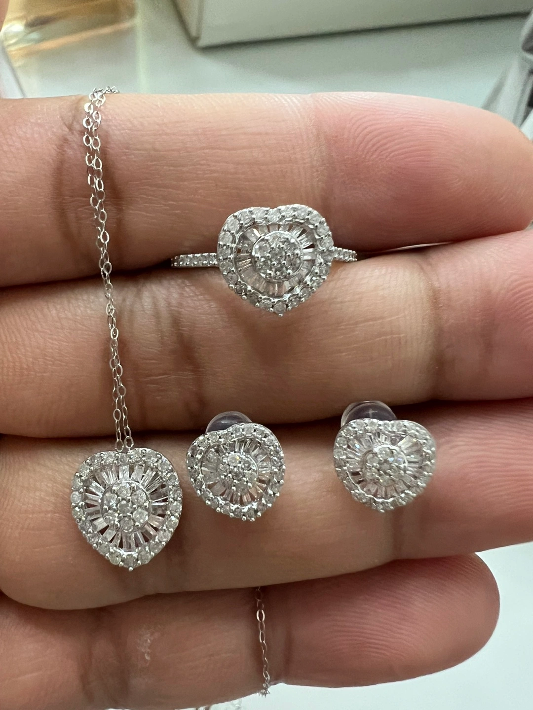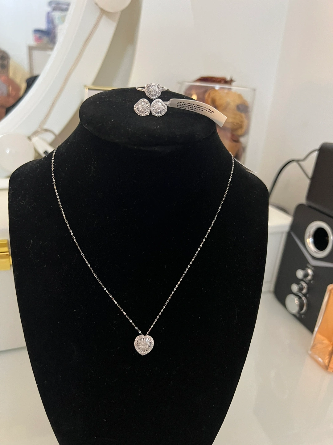 Brand new. Real 18k solid gold. Real natural diamond. 0.420 ctw of natural diamond earrings. 0.420 ctw of natural diamond necklace. 0.420 ctw of natural diamond of rings. Necklace is 16-18 inches adjustable. Comes with gem certificate