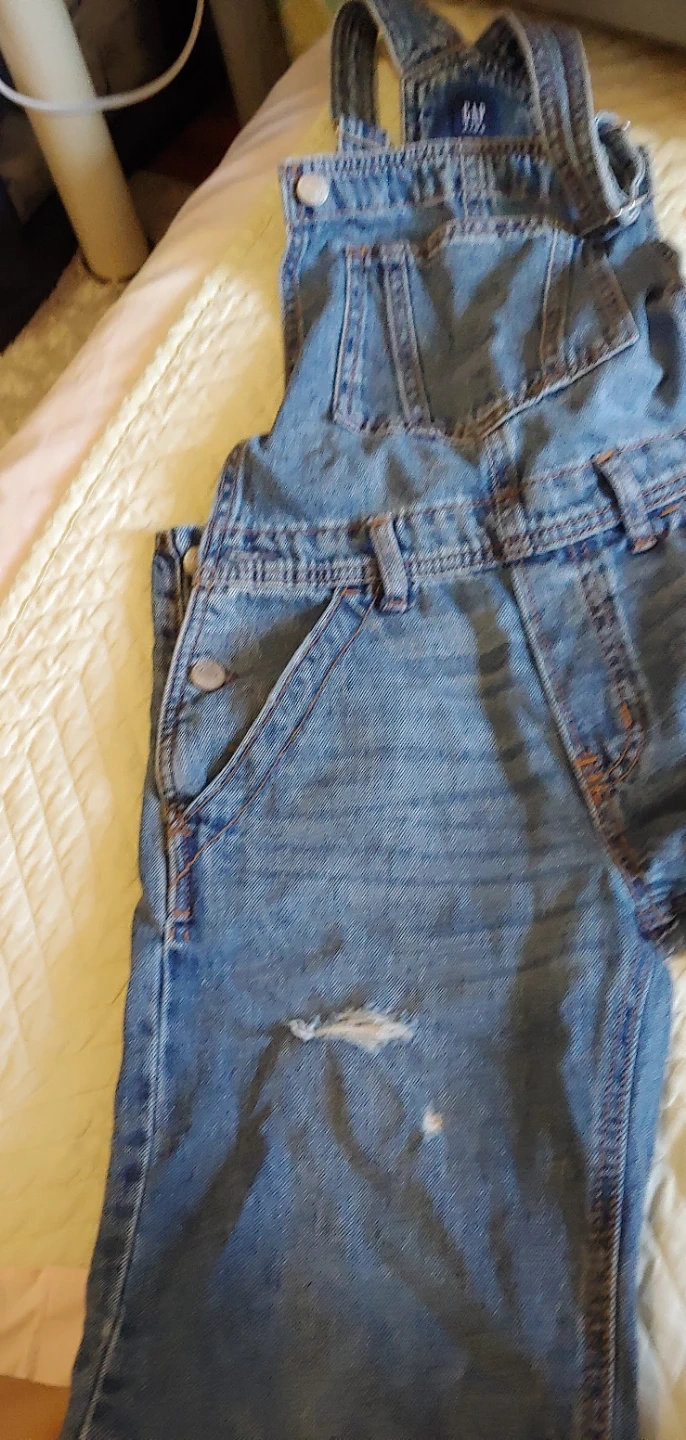 Selling a pair of Gap Kids denim overalls in size L. They're in good condition with a stylish distressed look. Perfect for your little one!
