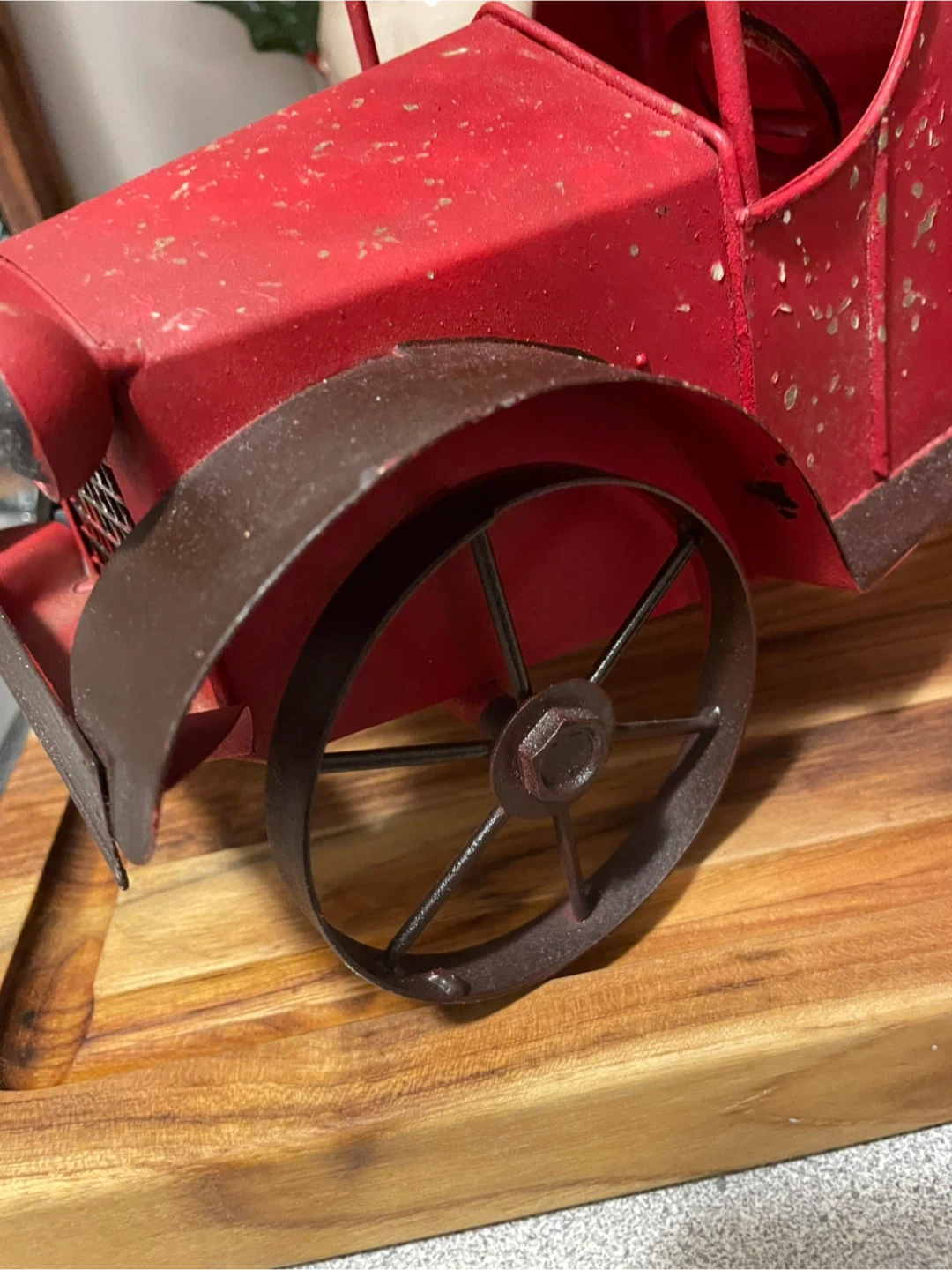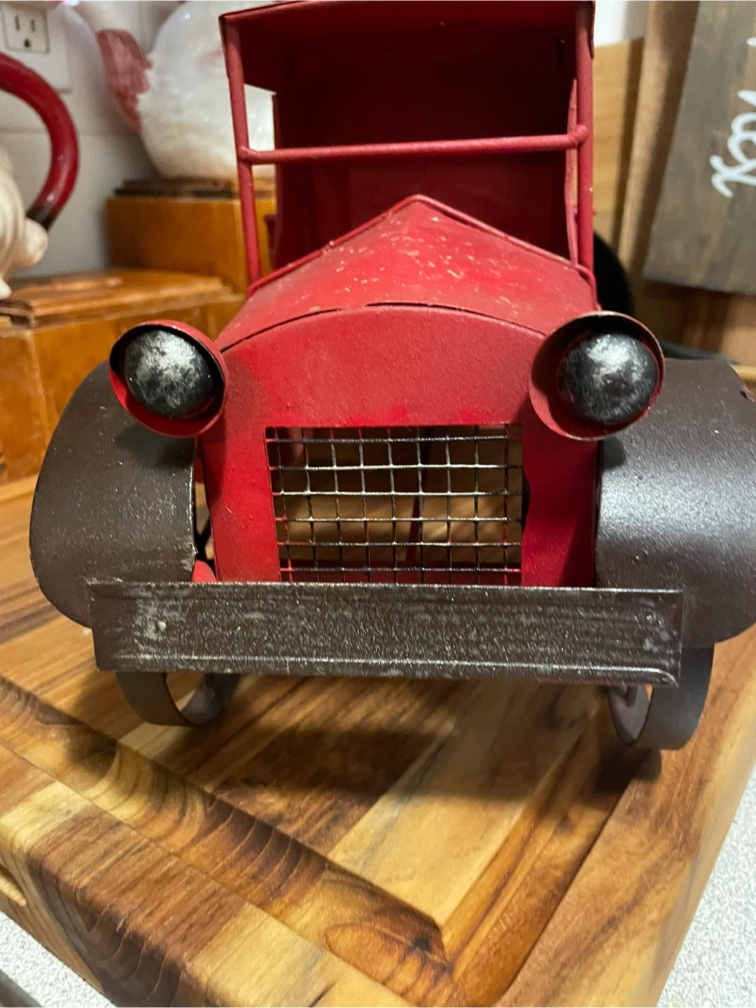 Here's a charming red metal antique truck, perfect for adding a vintage touch to your home decor! It has a rustic look with some distressed detailing, giving it a unique character. It would look great on a shelf or as a centerpiece