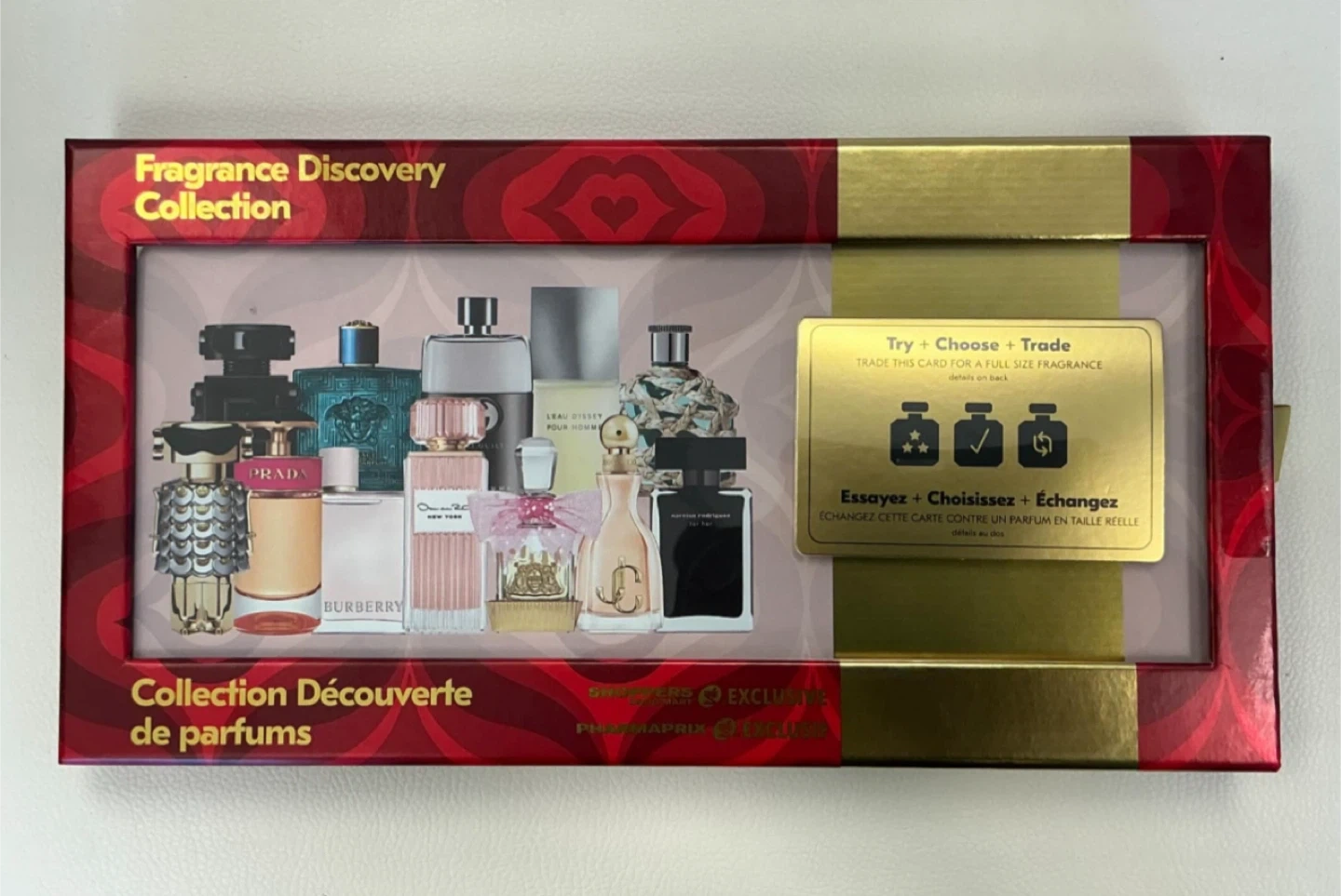 This is a Fragrance Discovery Collection set! It includes a card to try, choose, and trade for a full-size fragrance. A great way to sample different scents! The voucher is not included, just the vials in the box. None have been used at all.