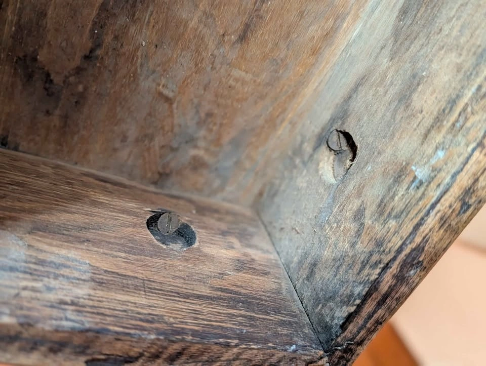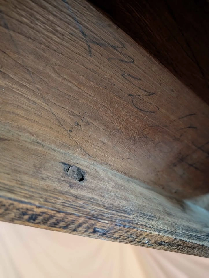The Top: Stripped and refinished to reveal the beautiful oak grain. I intentionally preserved the rustic character, marks, and patina of the wood—I didn't want it to look "new," I wanted it to look like it has a story to tell.