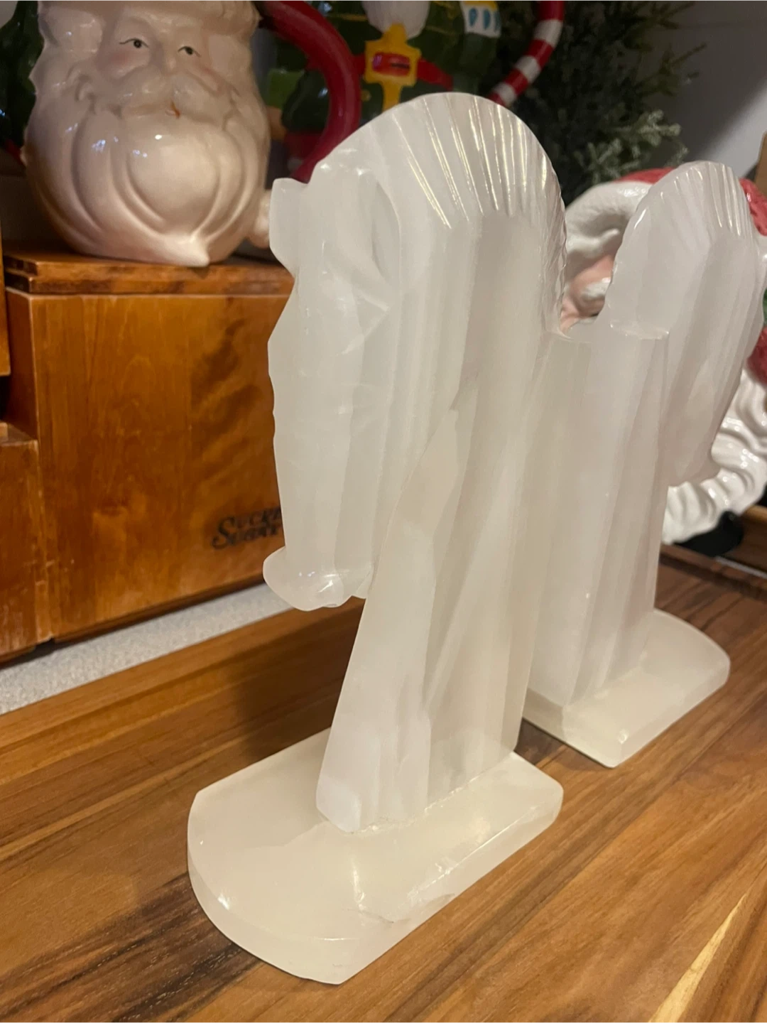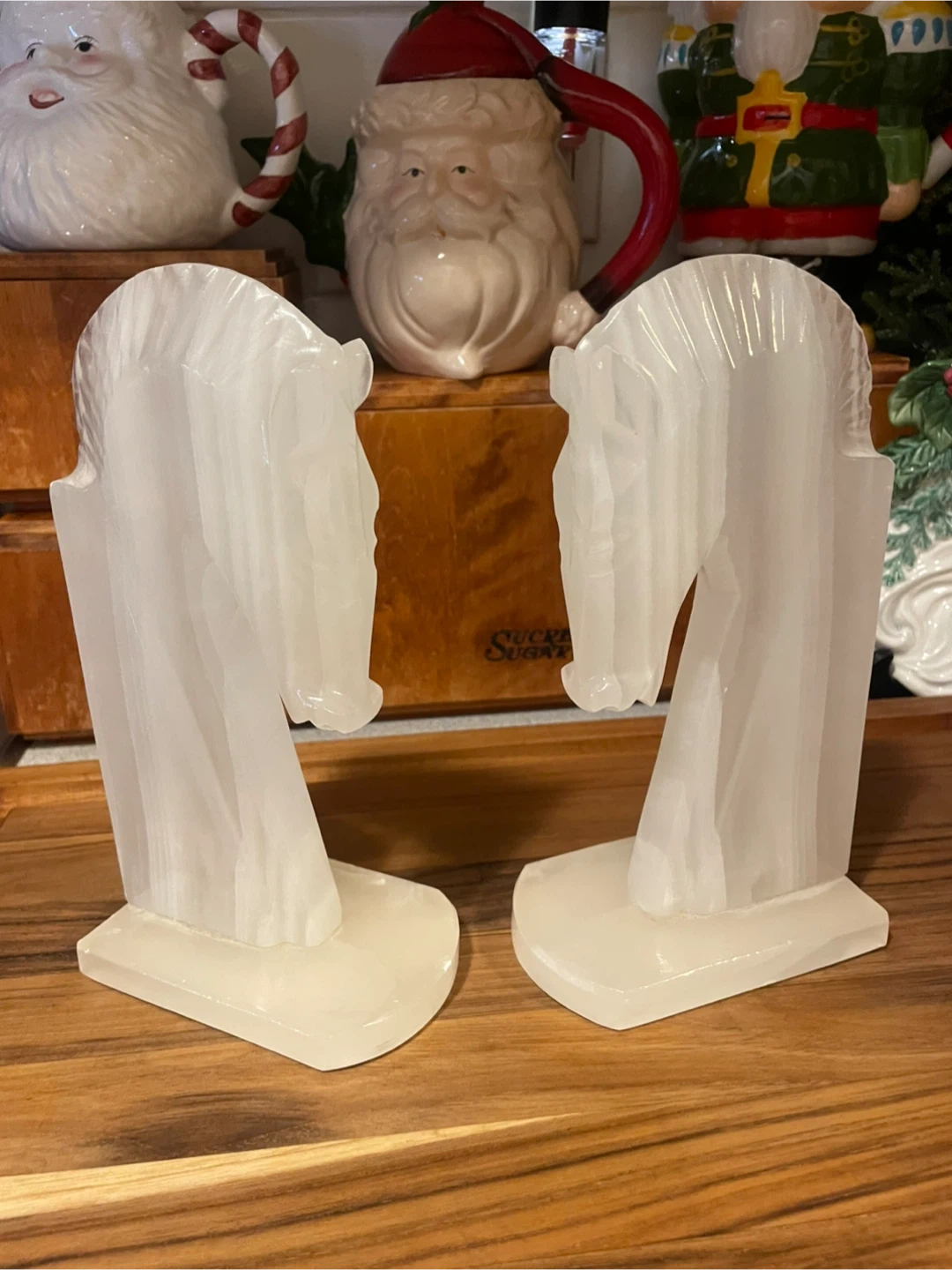 These are a beautiful pair of vintage white marble horse head bookends. They would make a lovely addition to any home library or office. They are in good condition and ready to be used!