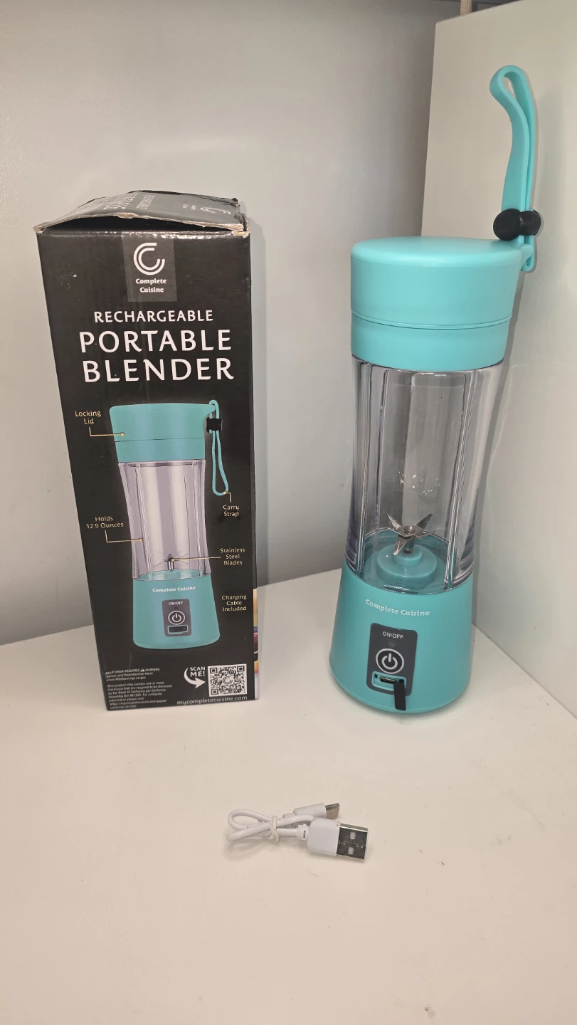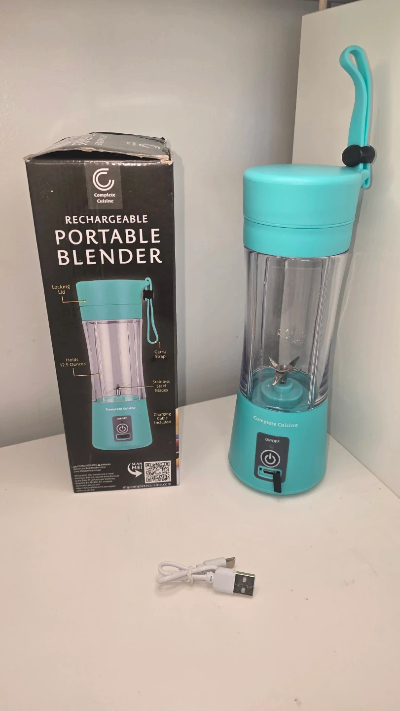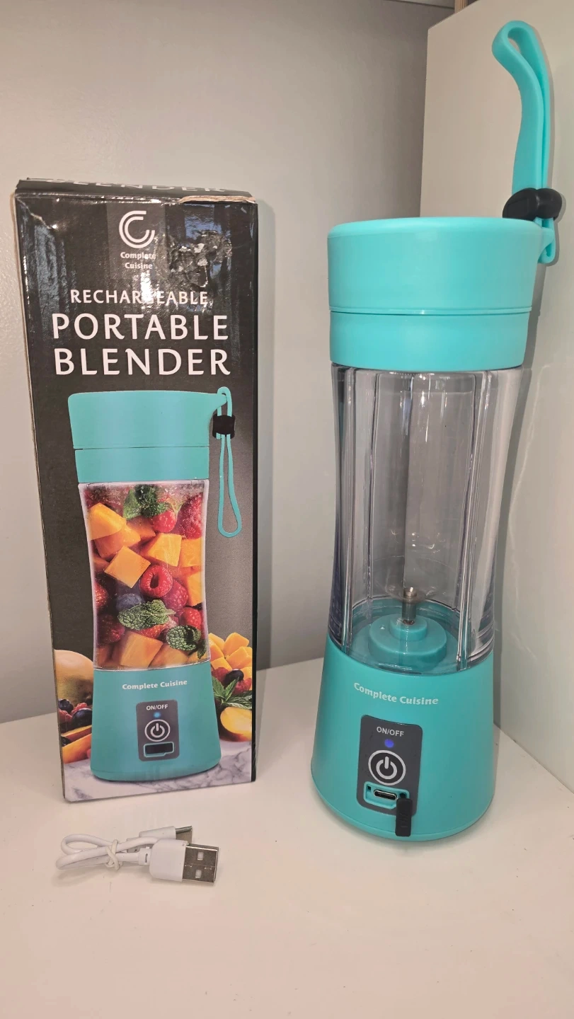 I'm selling a Complete Cuisine rechargeable portable blender in a lovely turquoise colour! It holds 12.9 ounces and has stainless steel blades. It also comes with a locking lid and carry strap. The charging cable is also included. The box is included as well!