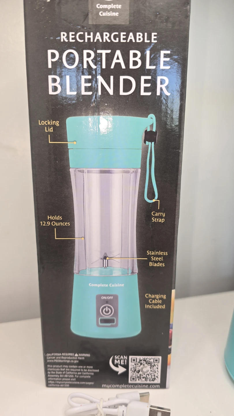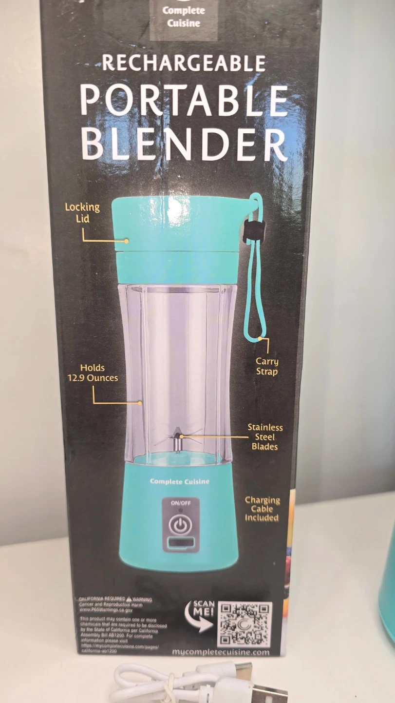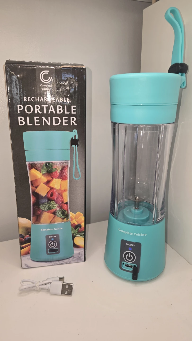 I'm selling a Complete Cuisine rechargeable portable blender in a lovely turquoise colour! It holds 12.9 ounces and has stainless steel blades. It also comes with a locking lid and carry strap. The charging cable is also included. The box is included as well!
