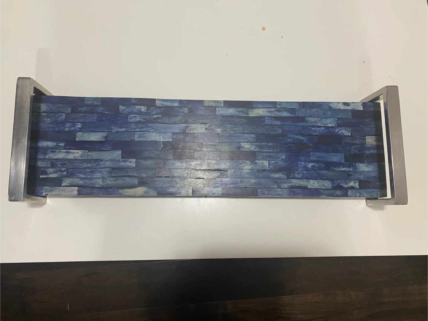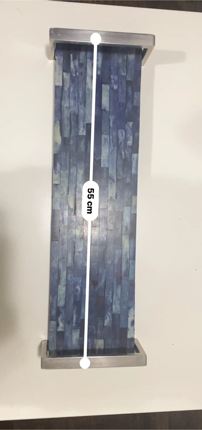 Selling two flower arrangements in glass vases with decorative stones. Also, a decorative blue tray with metal handles, measuring 55cm in length. Great for adding a touch of elegance to any room!