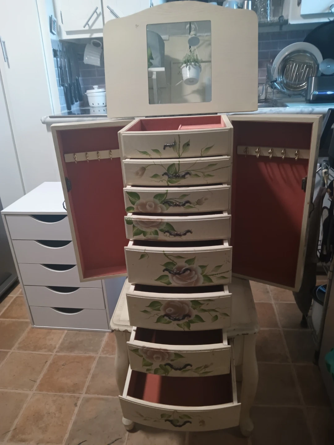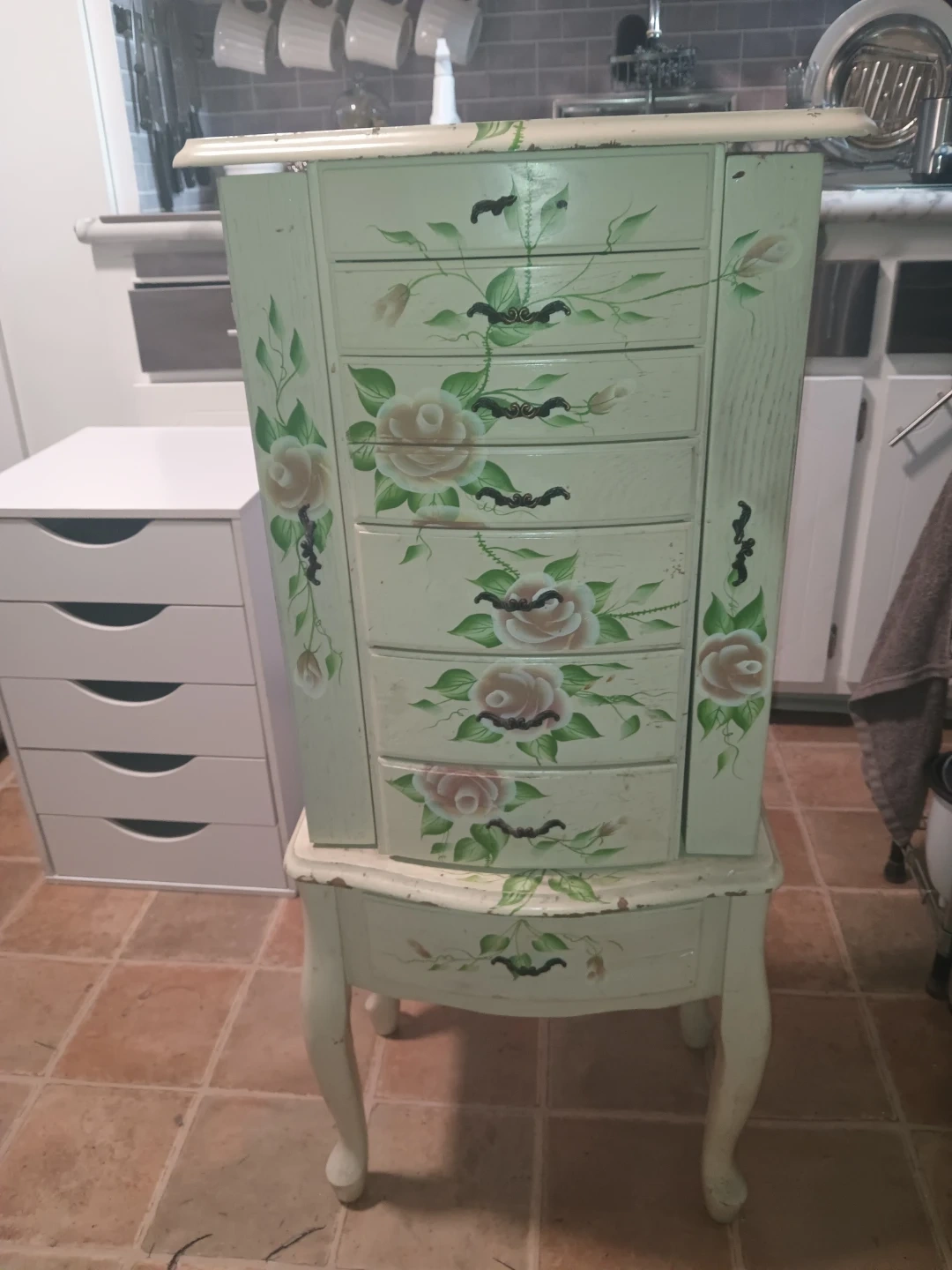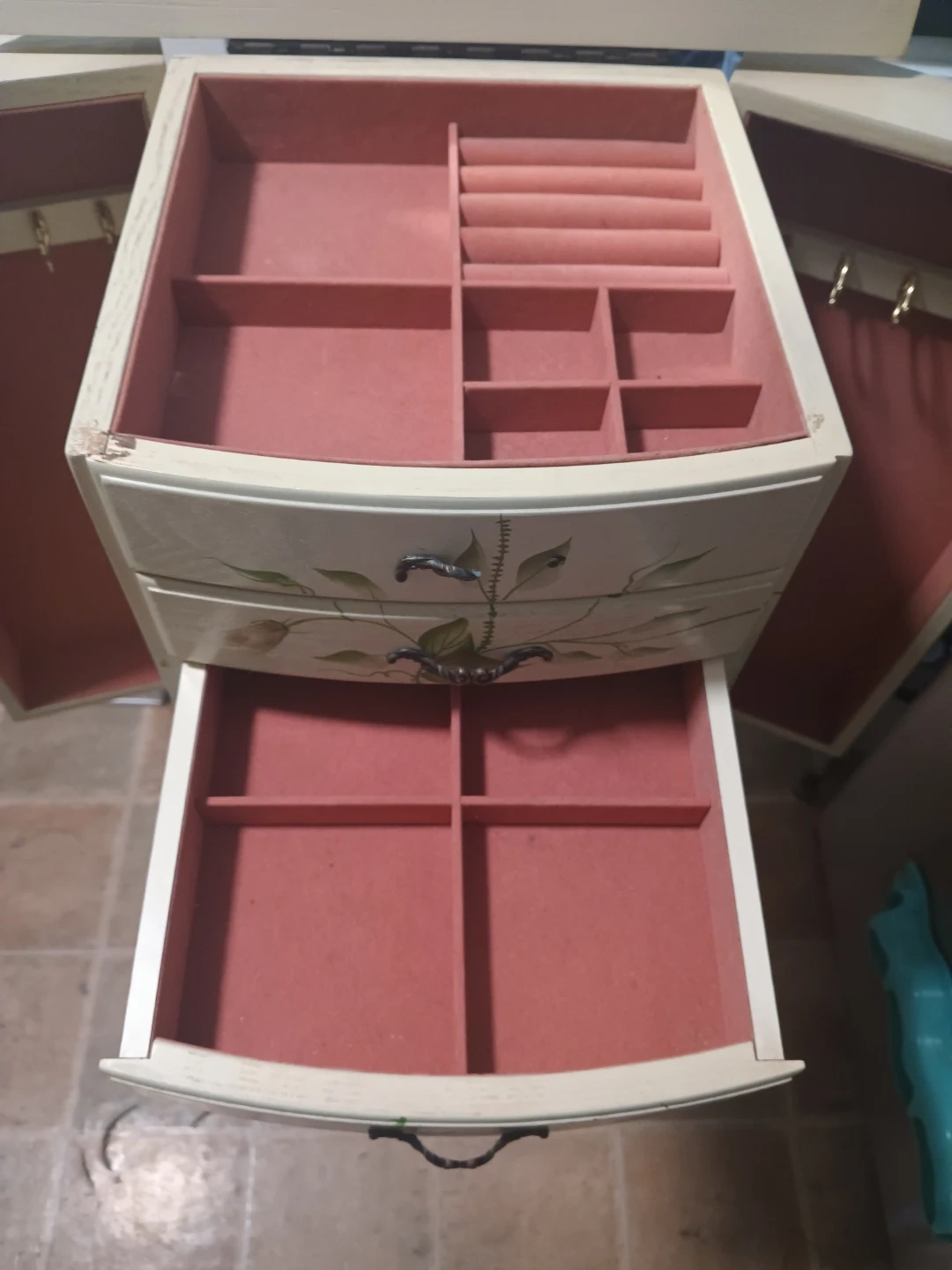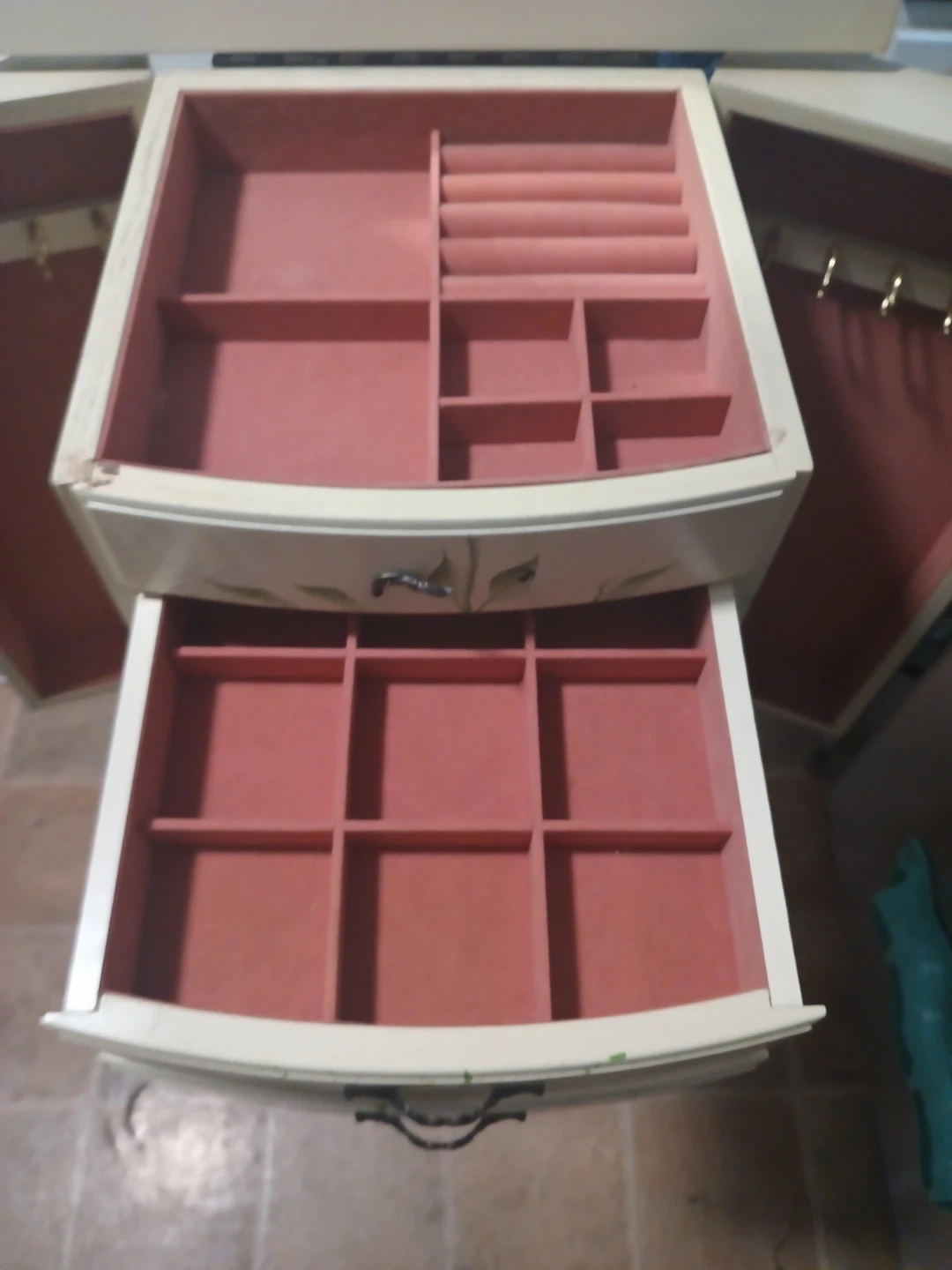 Selling a Coaster Furniture Jewelry Armoire. It need a paint job and one handle is broken. The interior is lined with pink velvety material in great condition. Plenty of drawers for jewelry and cosmetics.