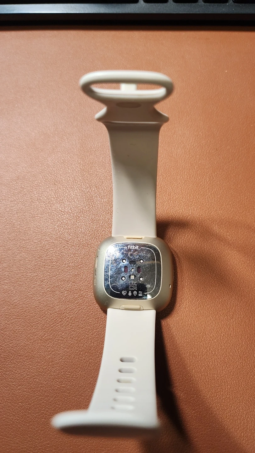 Selling a Fitbit Sense advanced smartwatch in soft gold and sand band. It comes with the box and charging cable. This smartwatch is designed to help you manage stress and monitor your health.