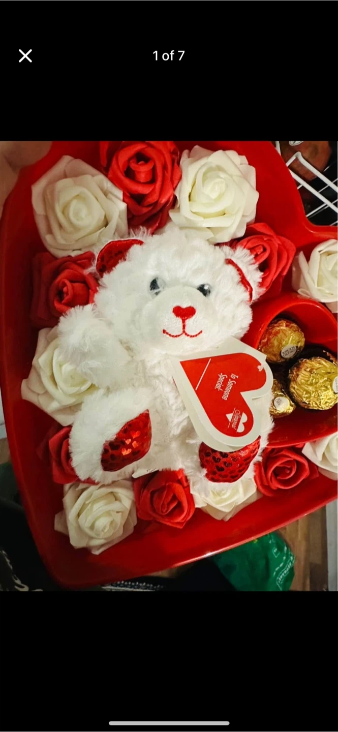 A cute teddy bear surrounded by red and white roses, plus some delicious chocolates! Perfect as a gift for someone special