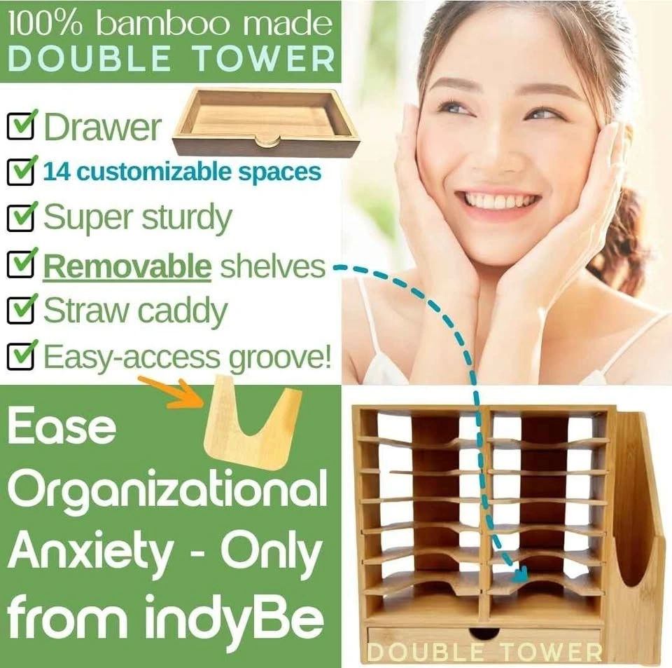 indyBe Bamboo Tumbler Lid Organizer – Space Saving Multi-Tier Storage Rack with Straw Holder and Gasket Drawer – Vertical Cup Lid Organizer for Cabinet, Kitchen Countertop - Double