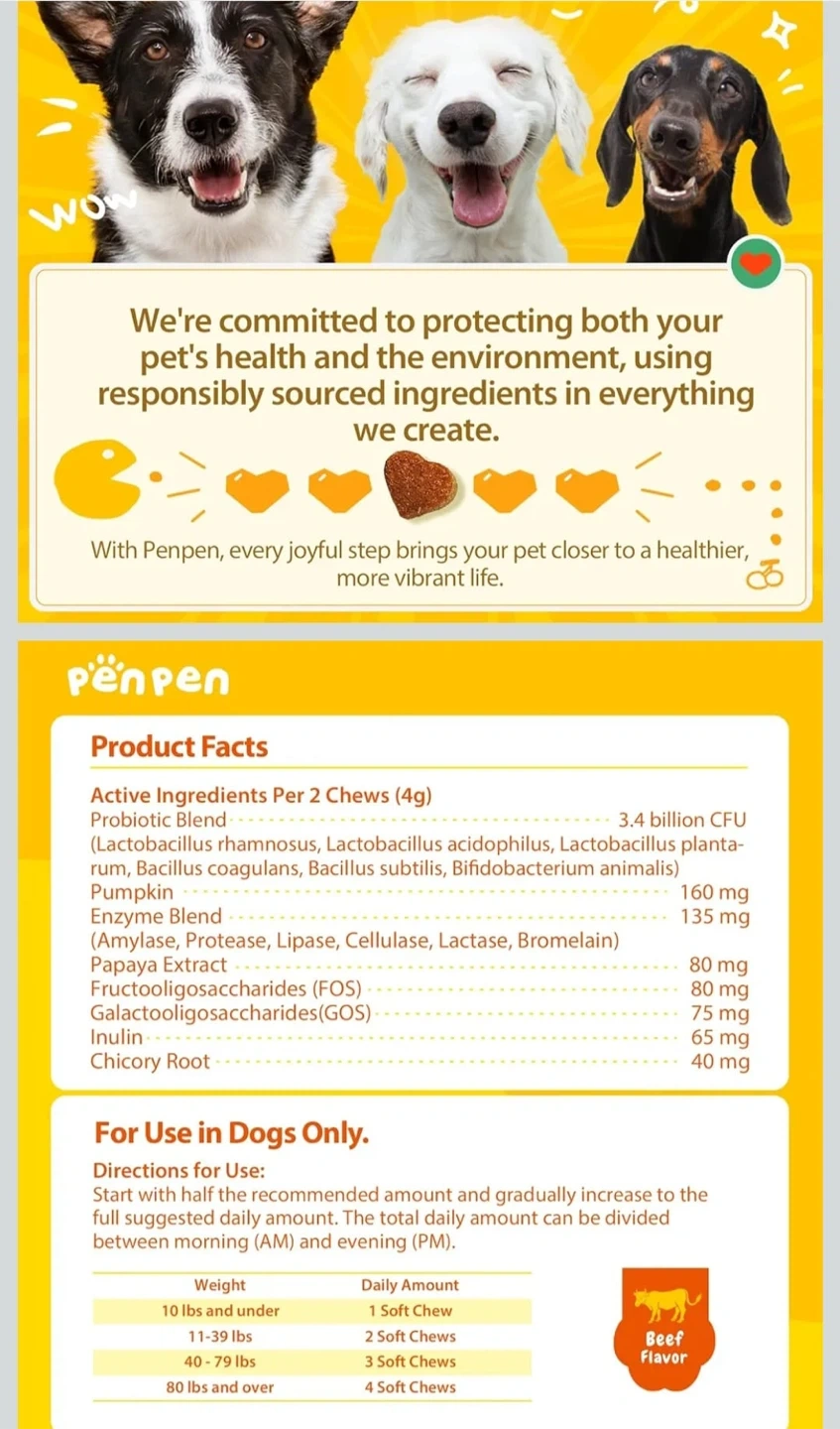 Got some PenPen Probiotic Soft Chews for dogs! These are beef flavored and great for gut health and immune support. They contain 3.4 billion CFU blend of 6 probiotics, pumpkin, enzyme blend, papaya extract, and chicory root. They're also 100% natural!