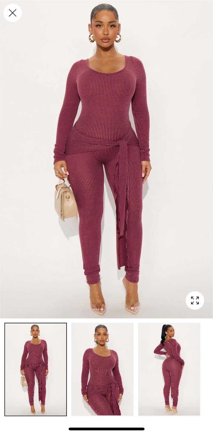 This is a Fashion Nova ribbed jumpsuit in a beautiful burgundy colour! It features a scoop neck, long sleeves, and a tie waist. Perfect for a night out or a casual day look