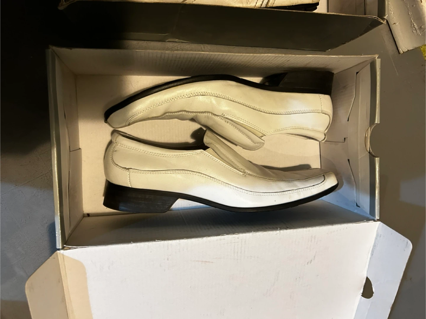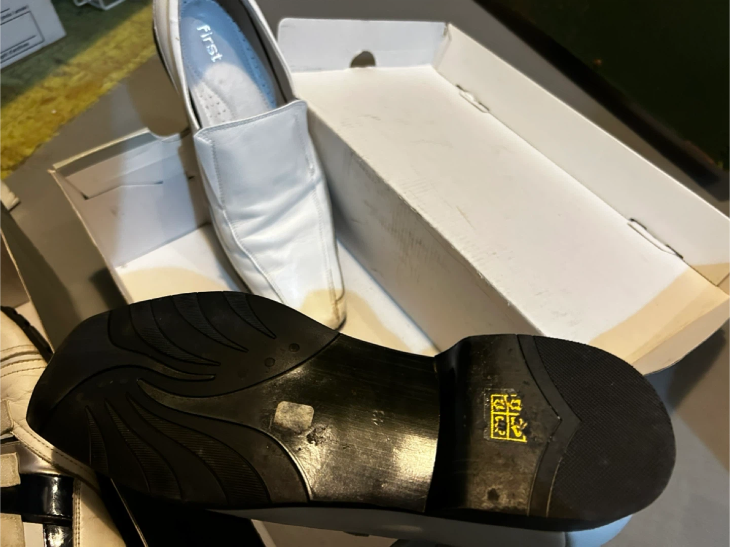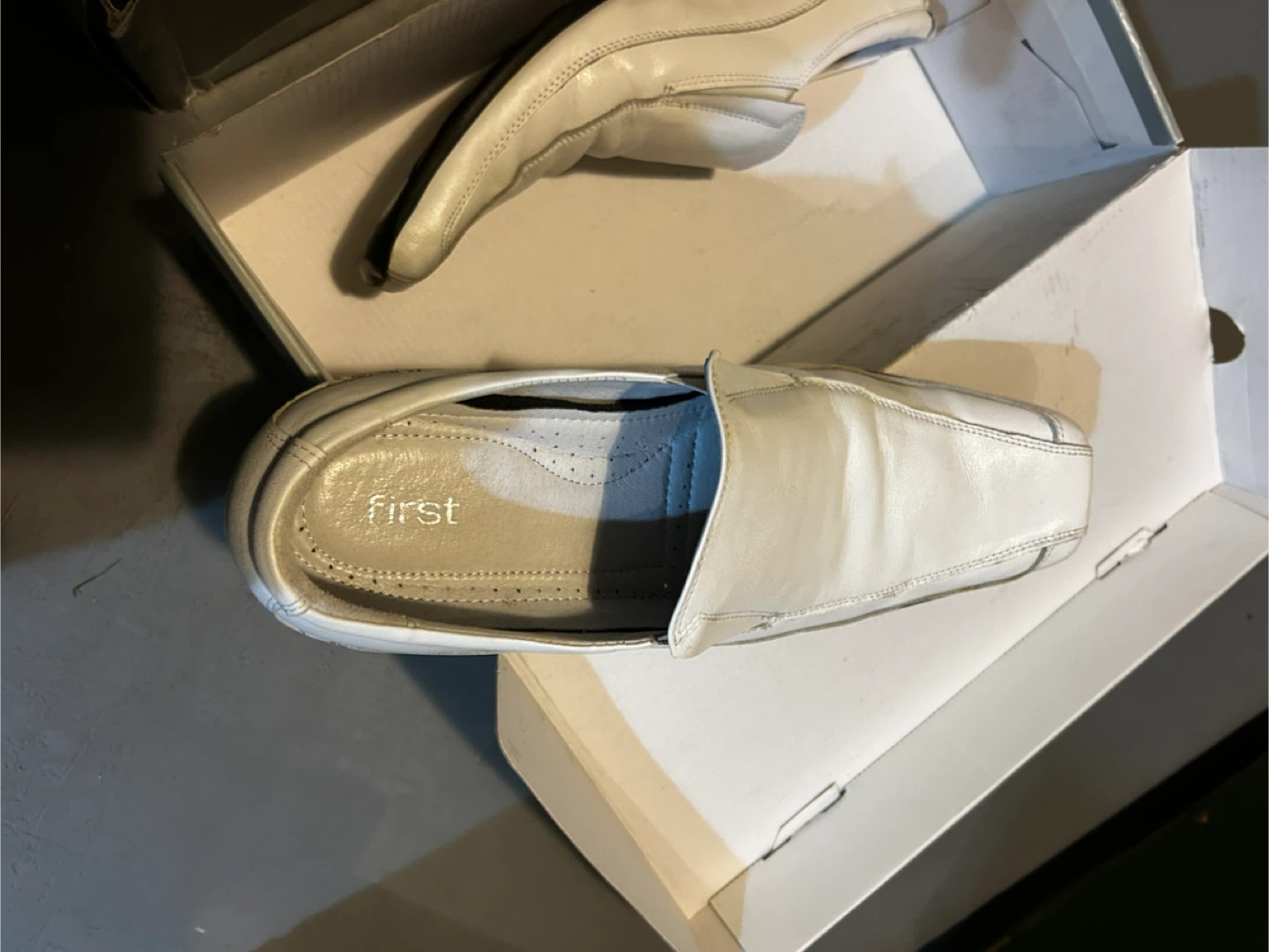 š„Selling a pair of white leather loafers from First. They come with the original box. They show some signs of wear but are still in good condition. Wore less than 5X