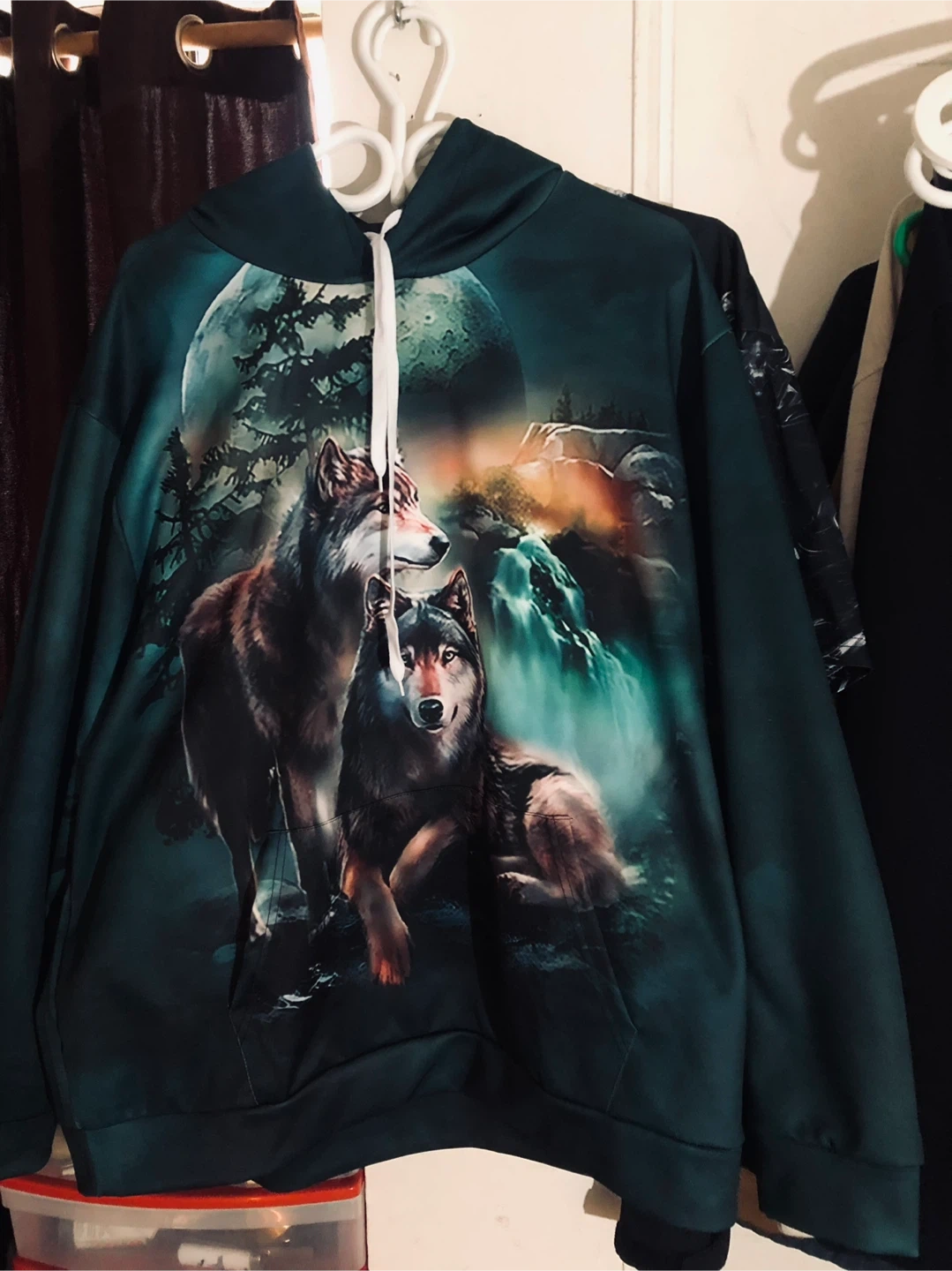 Selling a hoodie with a wolf and waterfall design. It's a unique piece for anyone who loves nature-inspired clothing. The hoodie is in good condition and ready for a new owner!