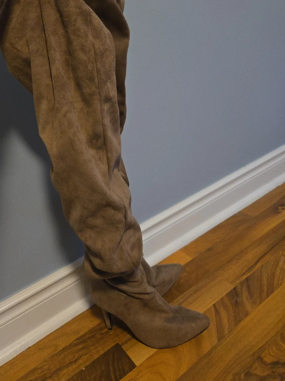 Selling a pair of stylish brown thigh-high heel boots. These are perfect for adding a touch of elegance to any outfit! They appear to be in good condition and ready for a new owner