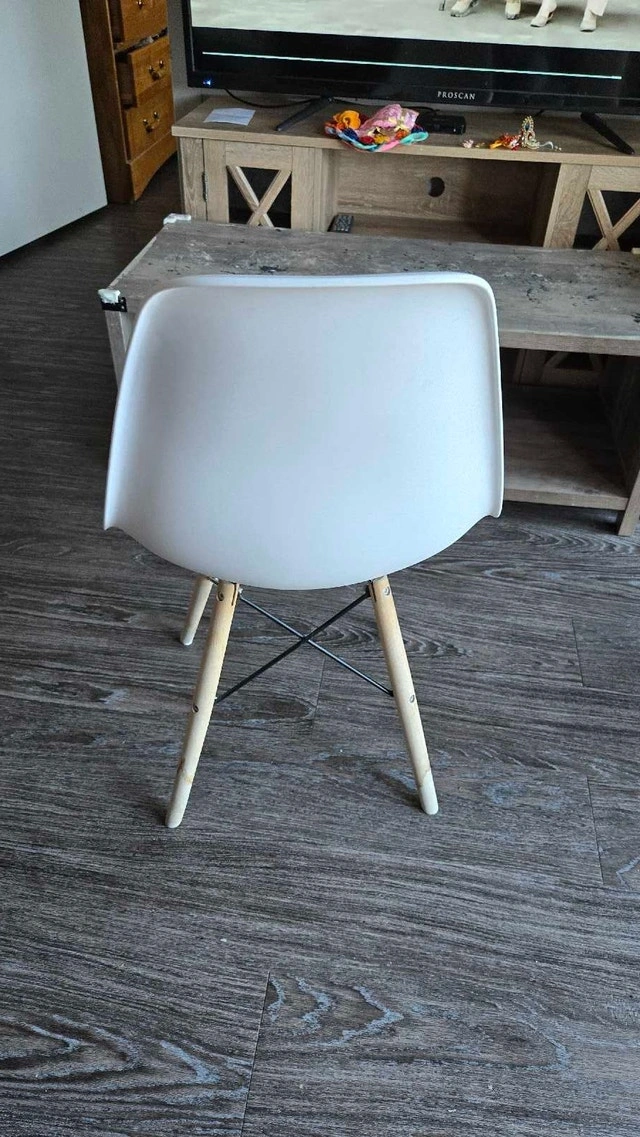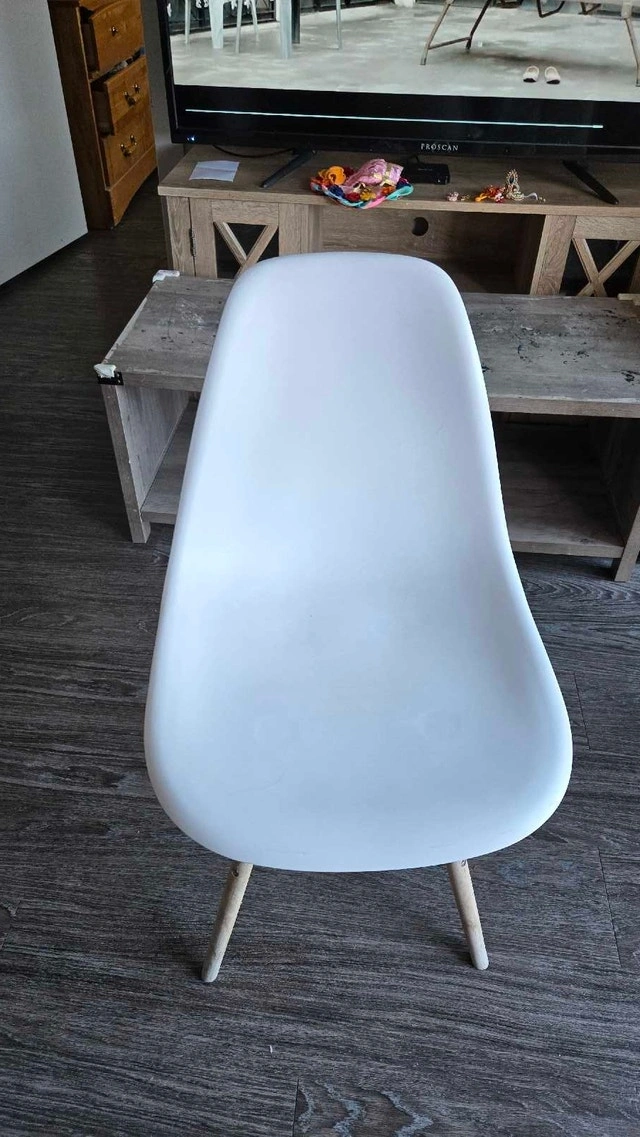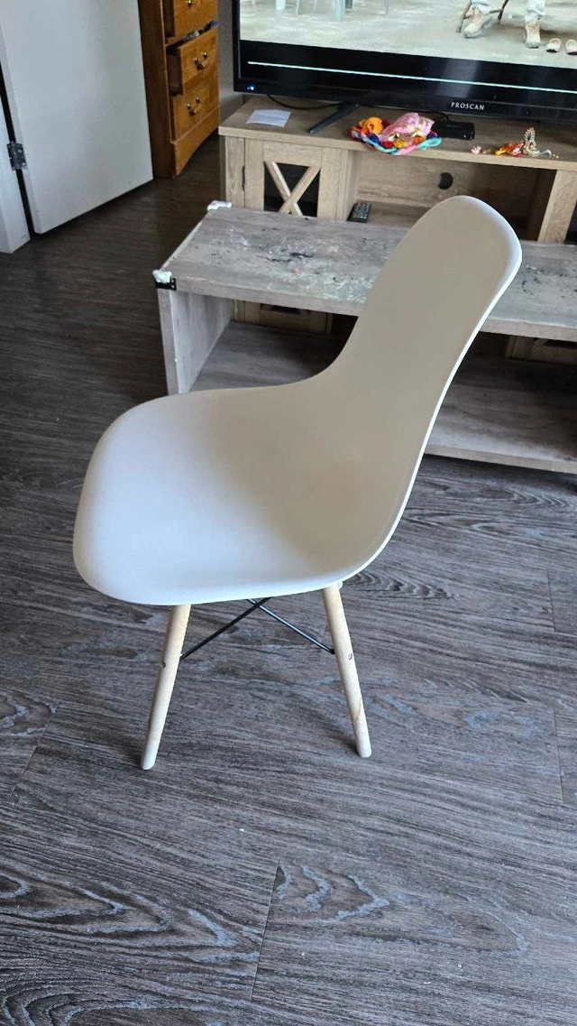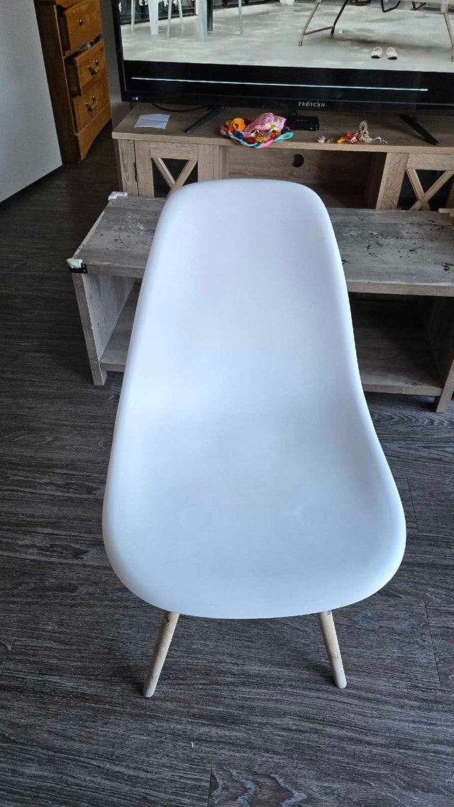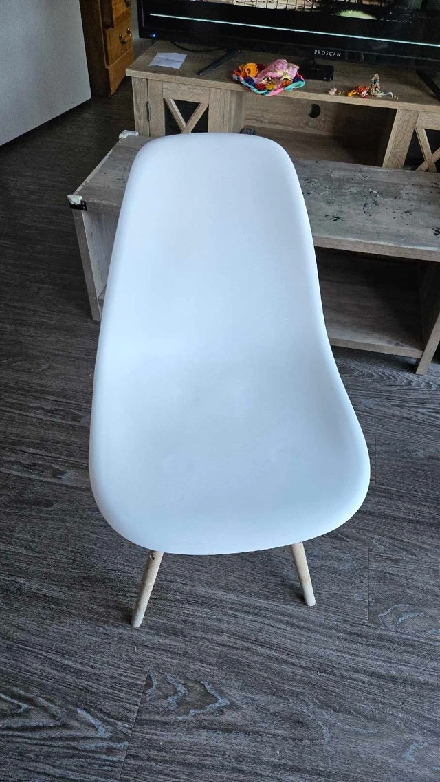 Add a touch of modern elegance to your space with this stylish white chair! Featuring a sleek design and sturdy wooden legs, this chair is perfect for your dining room, living room, or office. This chair is used, but in good condition, offering both comfort and durability. I am hoping for it to find a new home. If the ad is up, it's available!