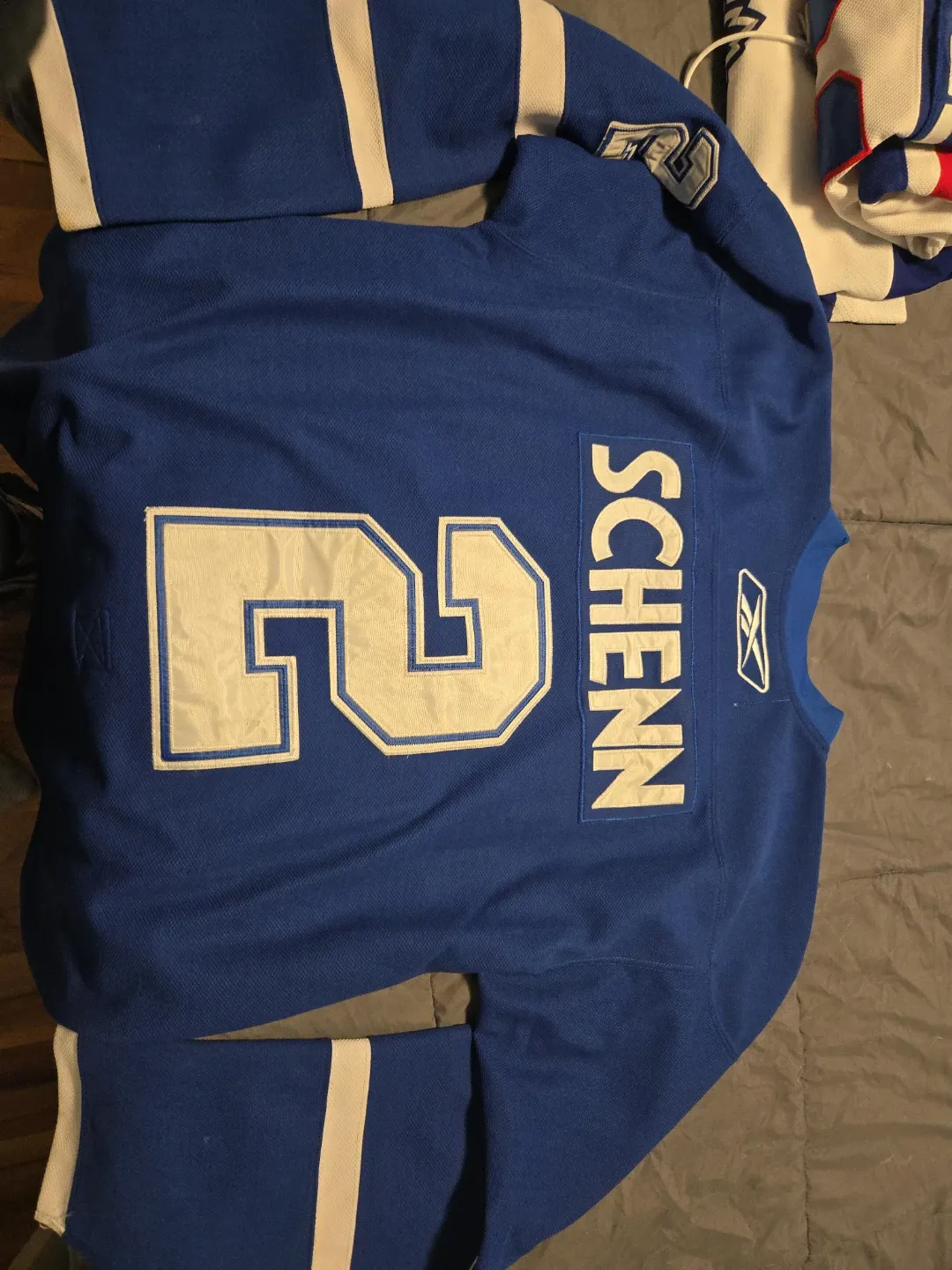 Selling a Reebok hockey jersey with the name SCHENN and number 2 on the back. It's blue with white accents. Great for any hockey fan!