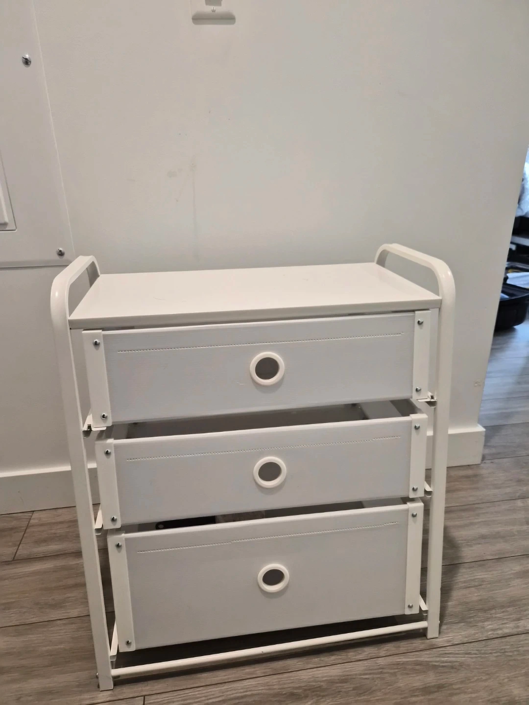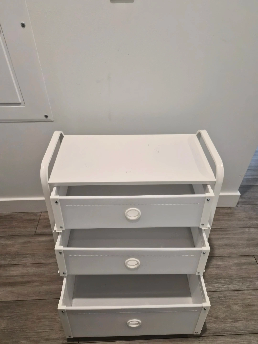 Here's a handy little storage unit with three drawers! It's perfect for organizing small items in any room. The unit is white and in great shape, ready to help you declutter your space