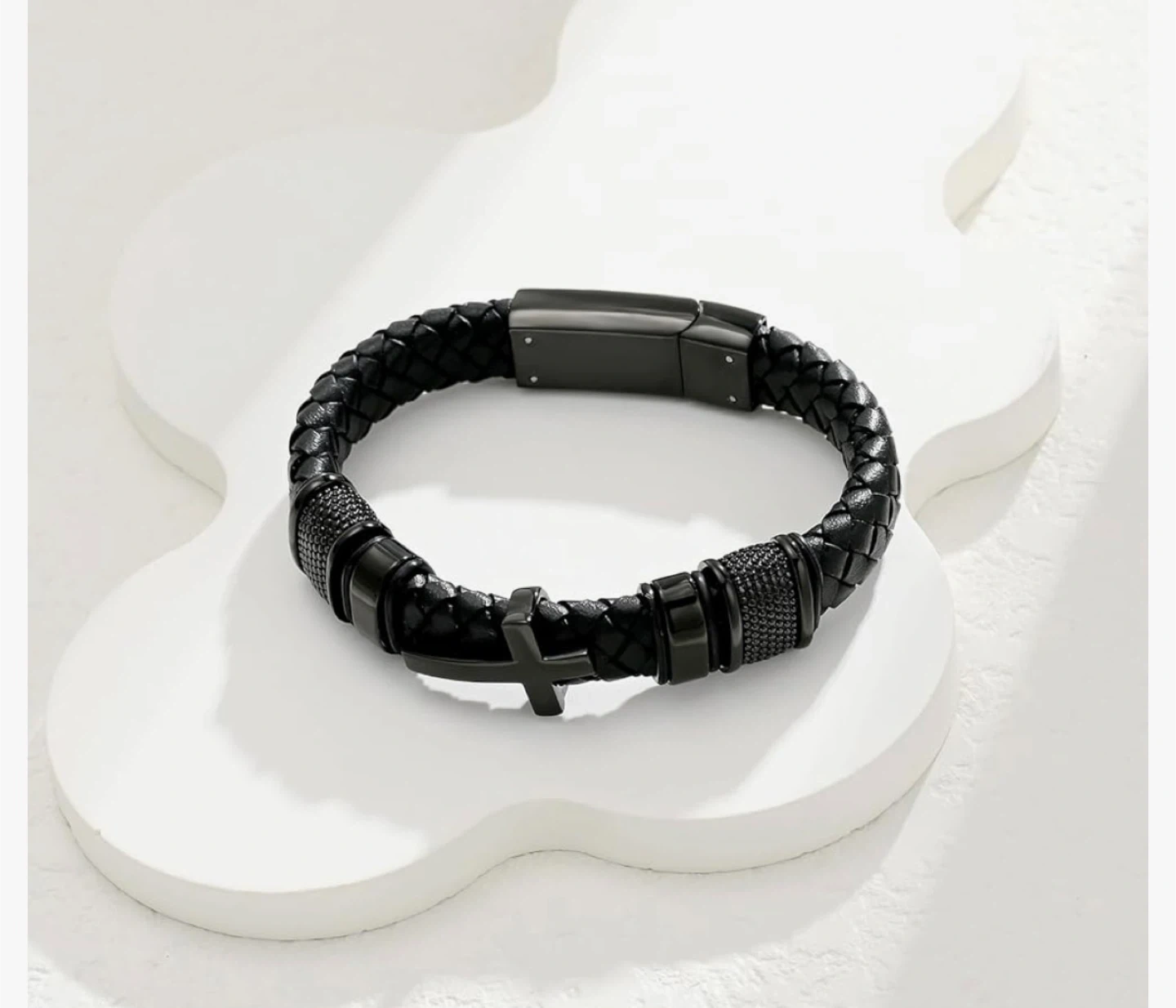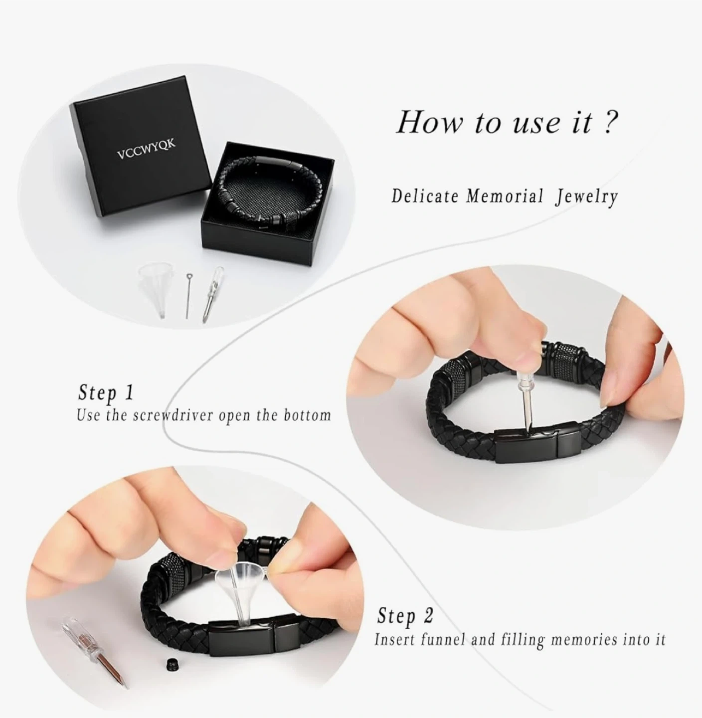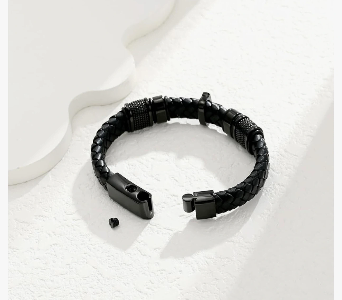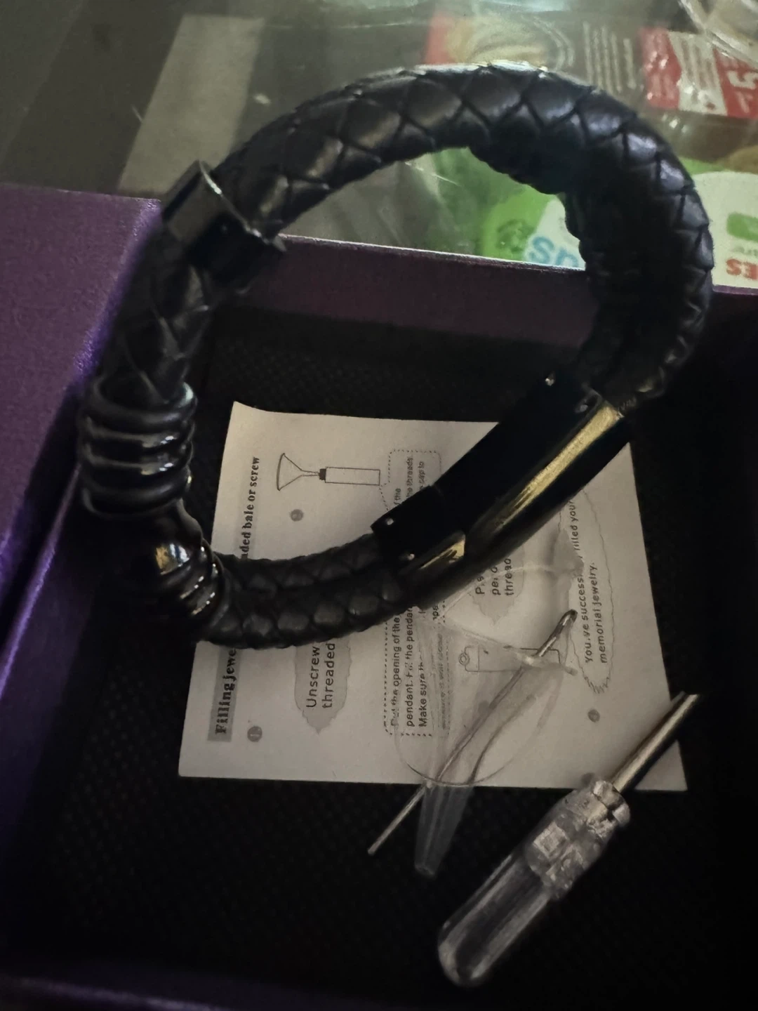 Selling a stylish black braided leather bracelet. It's designed as delicate memorial jewelry where you can insert memories into it.