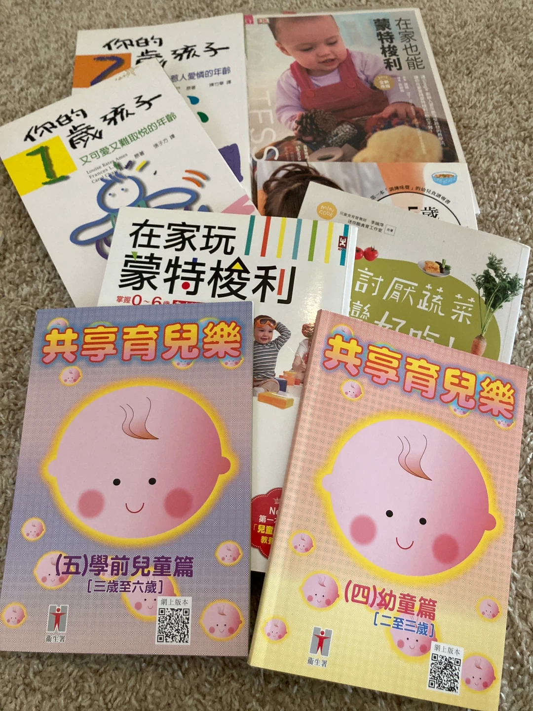 A collection of Chinese language parenting books for young children. Includes titles focusing on early childhood development and learning through play. Some titles include age ranges for 0-6 years, 2-3 years, and 3-6 years. Perfect for families looking to support bilingual education at home