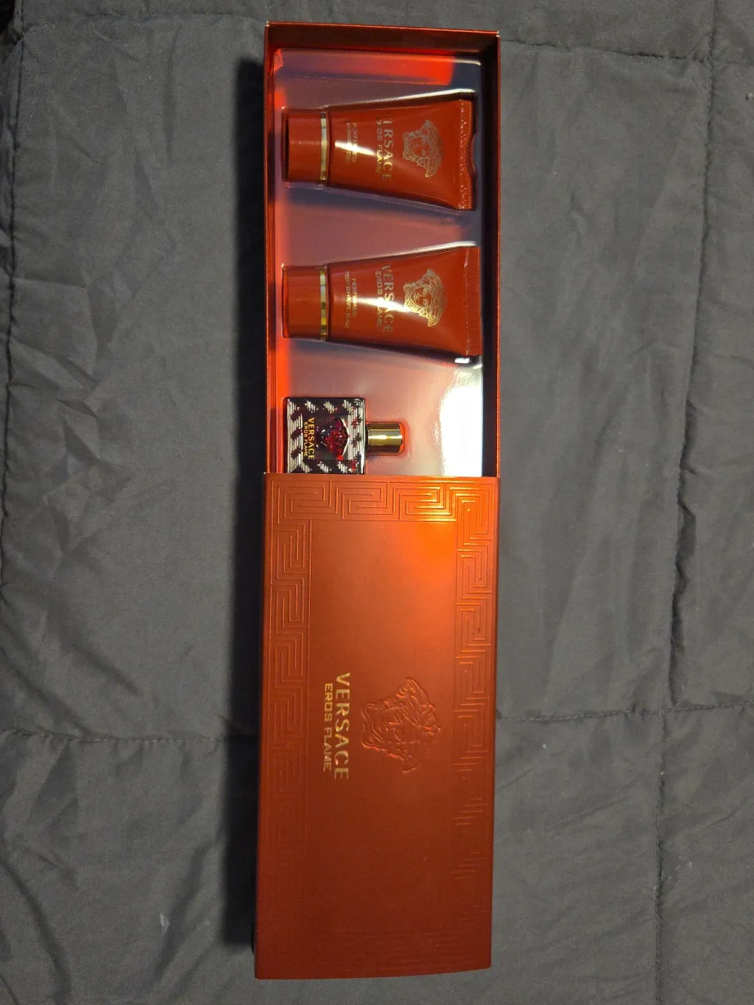 Selling a Versace Eros Flame gift set! It includes a small bottle of the cologne, and two tubes of body products. The set comes in its original box.