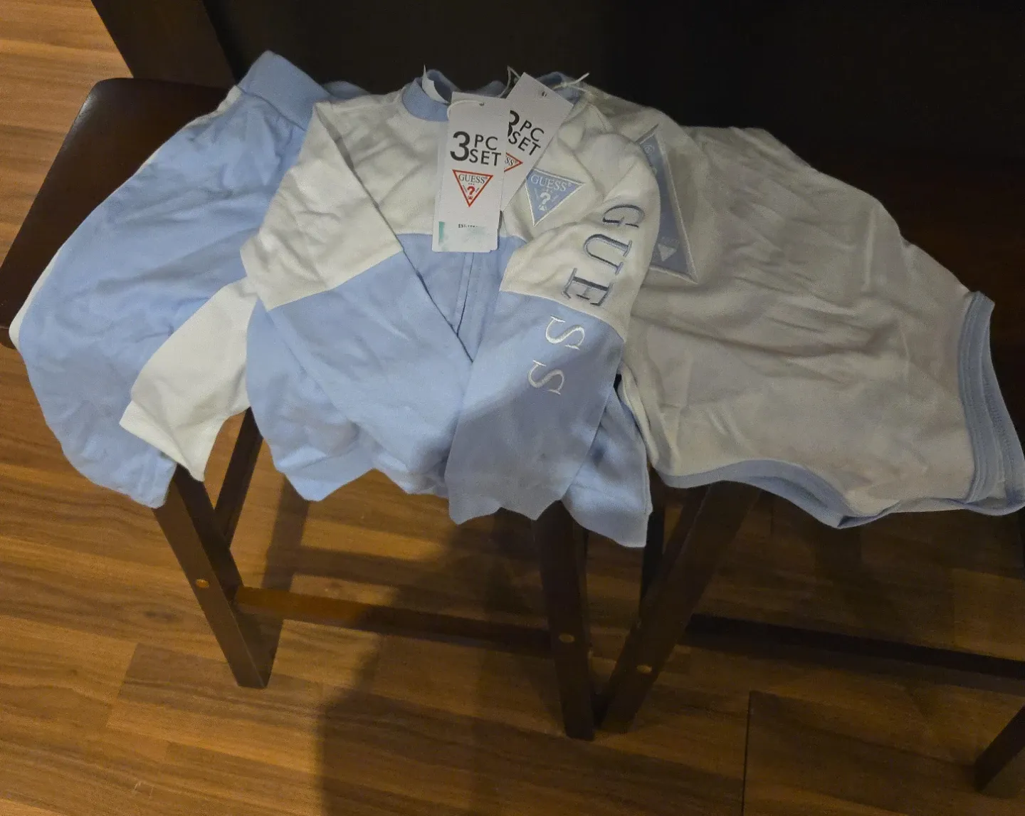 Selling a cute baby blue 3-piece set from Guess! Perfect for your little one. The set includes a top, pants, and a onesie, all in a soft, comfy material