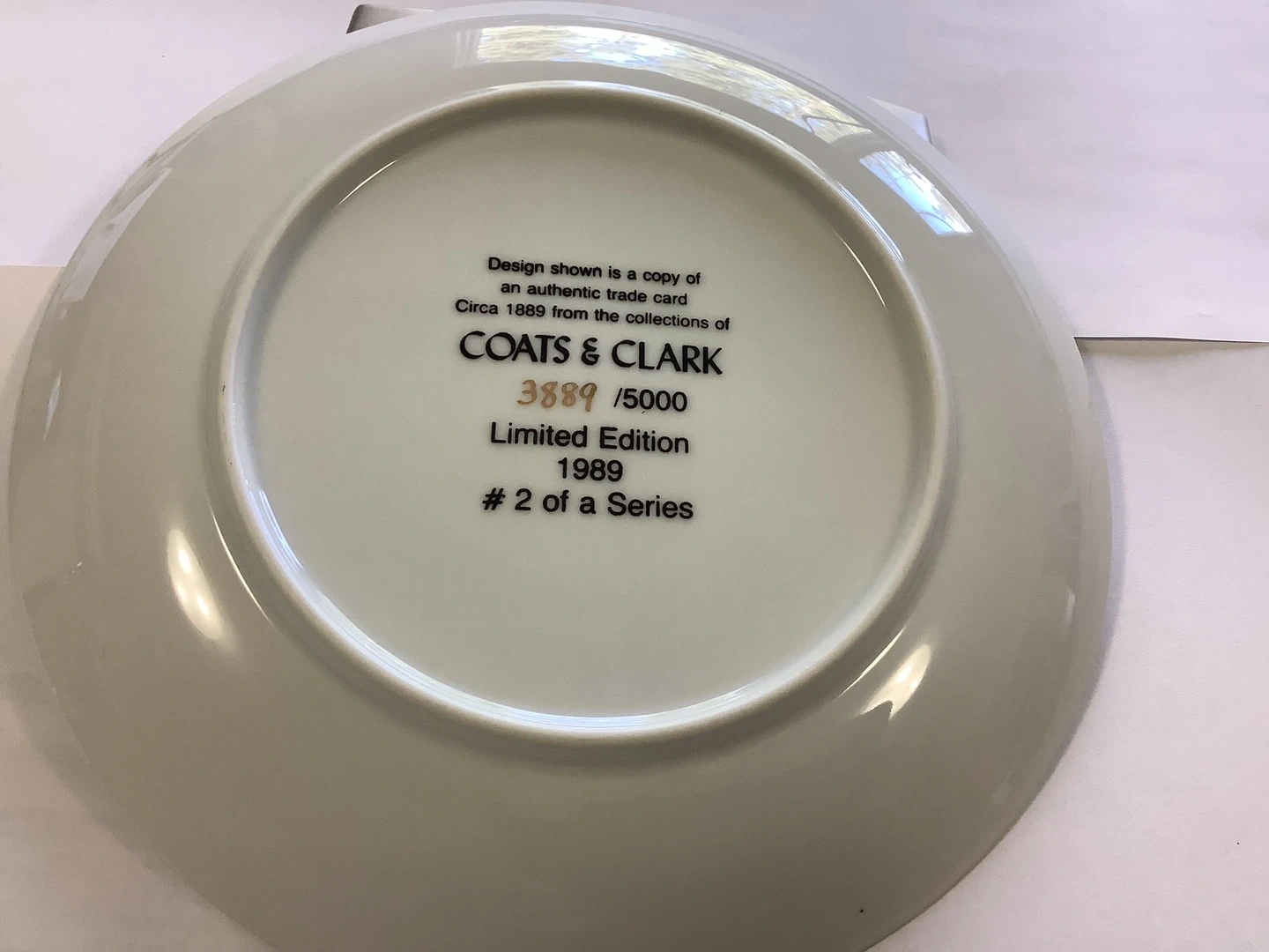 Selling a Coats & Clark limited edition collector plate. The design is a copy of an authentic trade card, circa 1889 from the collections of Coats & Clark. This is number 3889 out of 5000 and is #2 of a series. It comes with the original box