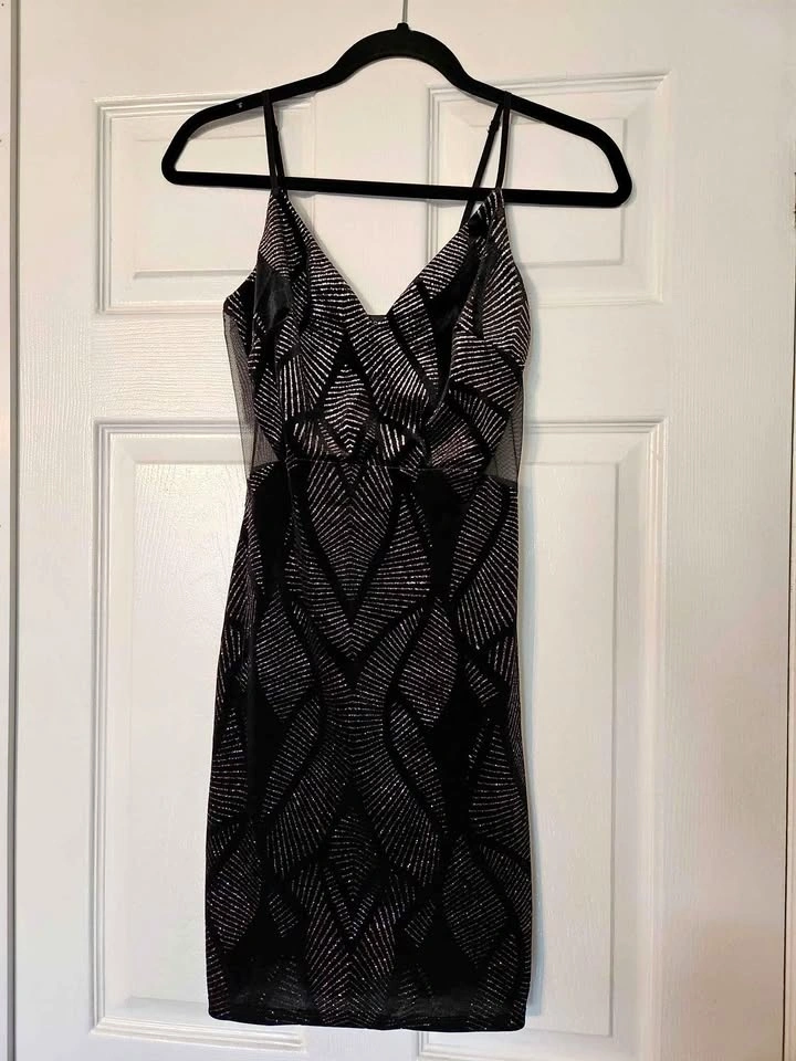 Never worn. Beautiful, Eclipse brand, size Small. Sheer across the top in the back and sides. Fitted. Adjustable straps adjust length of dress from 32-36.5". Would be a gorgeous dress to wear for a night out, NYE party, etc.