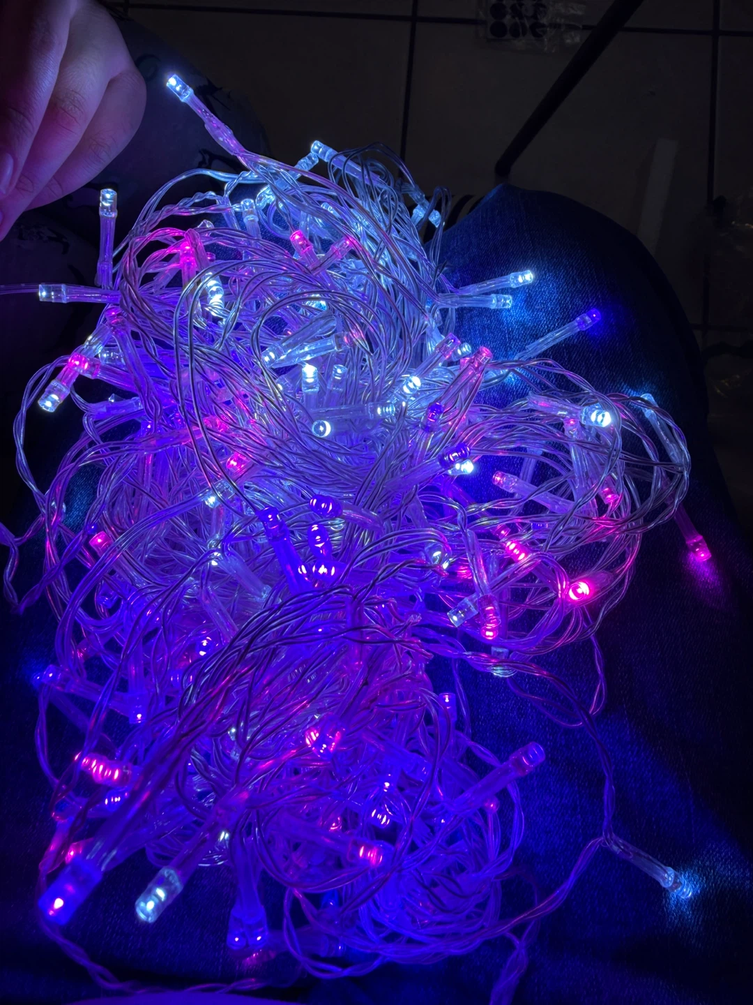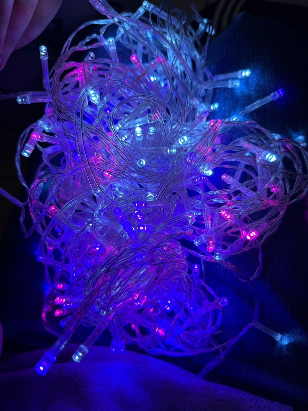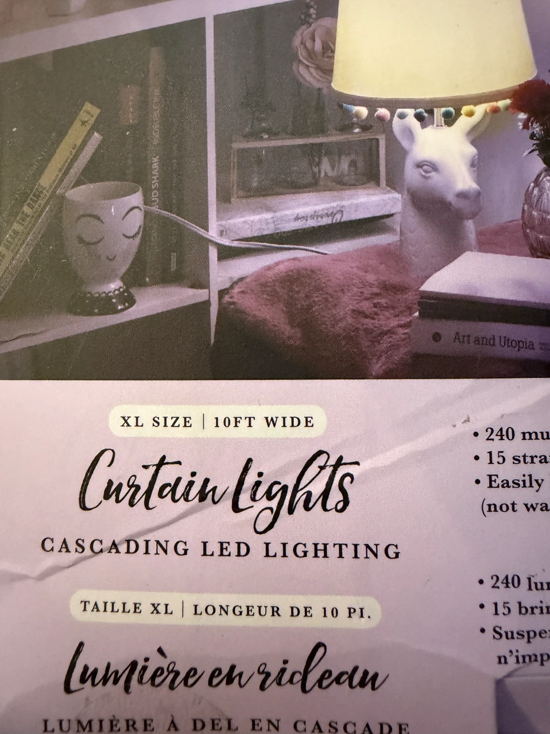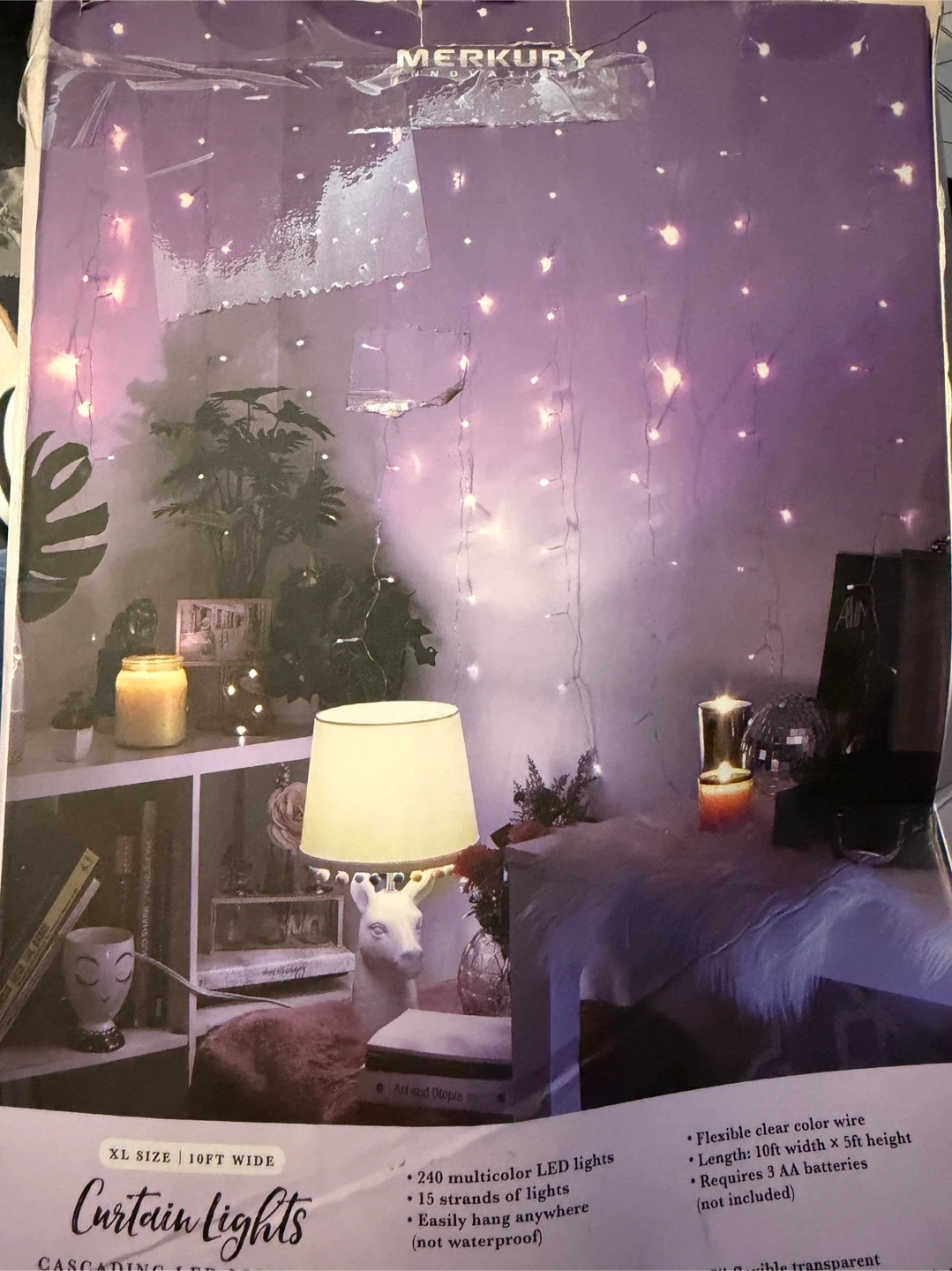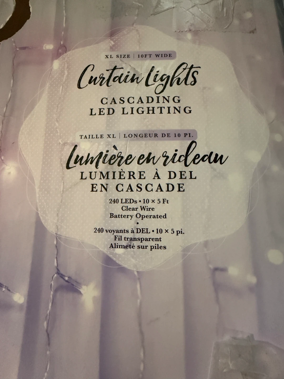 Selling New power tested curtain lights, cascading LED lighting. - XL size, 10ft wide - 240 multicolor LED lights - 15 strands of lights - Easily hang anywhere (not waterproof) - Flexible clear colour wire - Requires 3 AA batteries (not included)