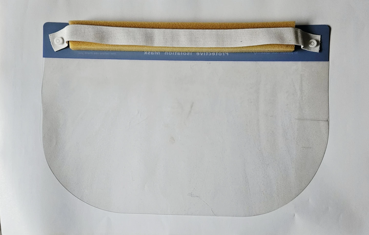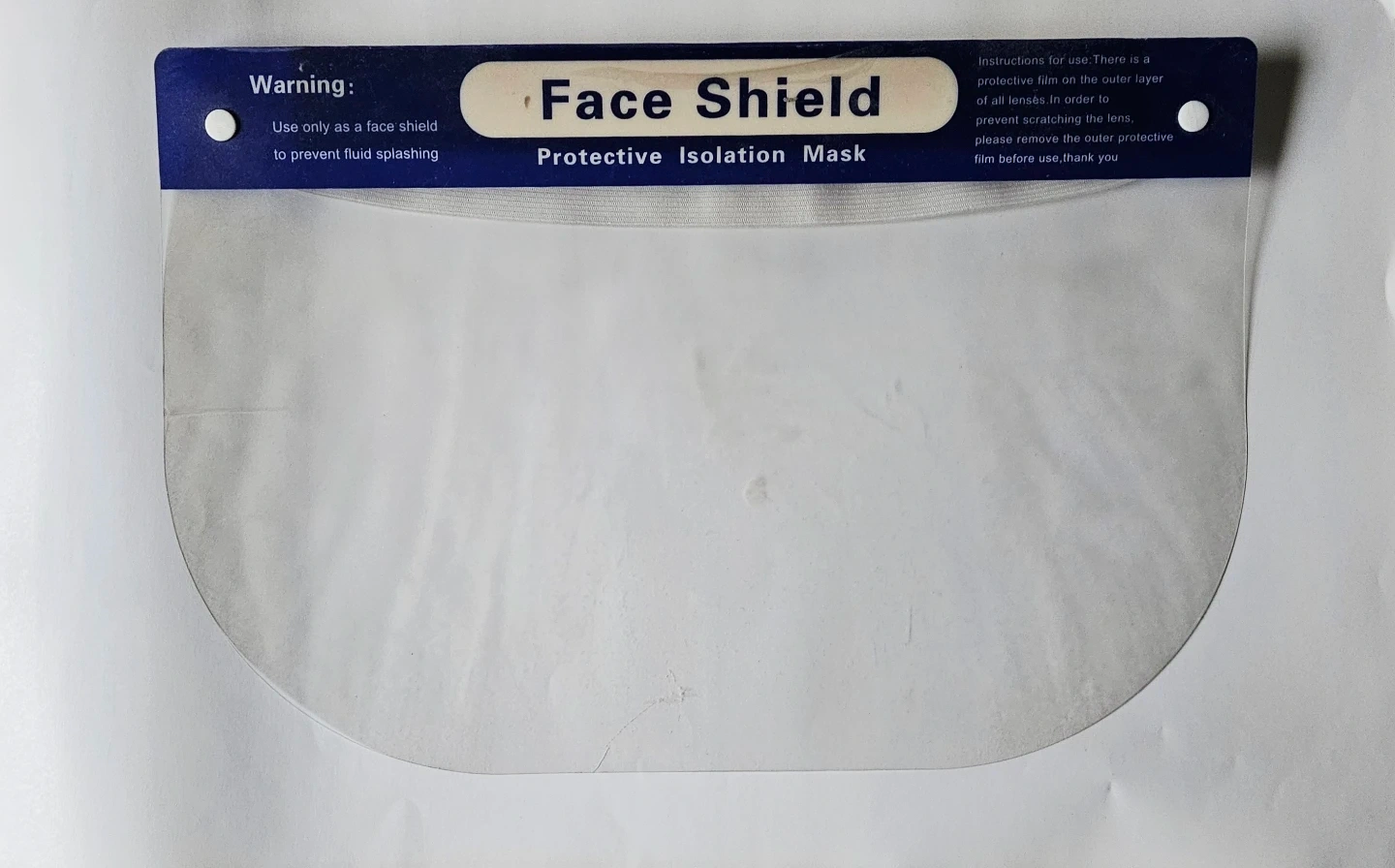 Giving away a face shield, a protective isolation mask. It's designed for use as a face shield to prevent fluid splashing. Instructions for use are printed on the mask.