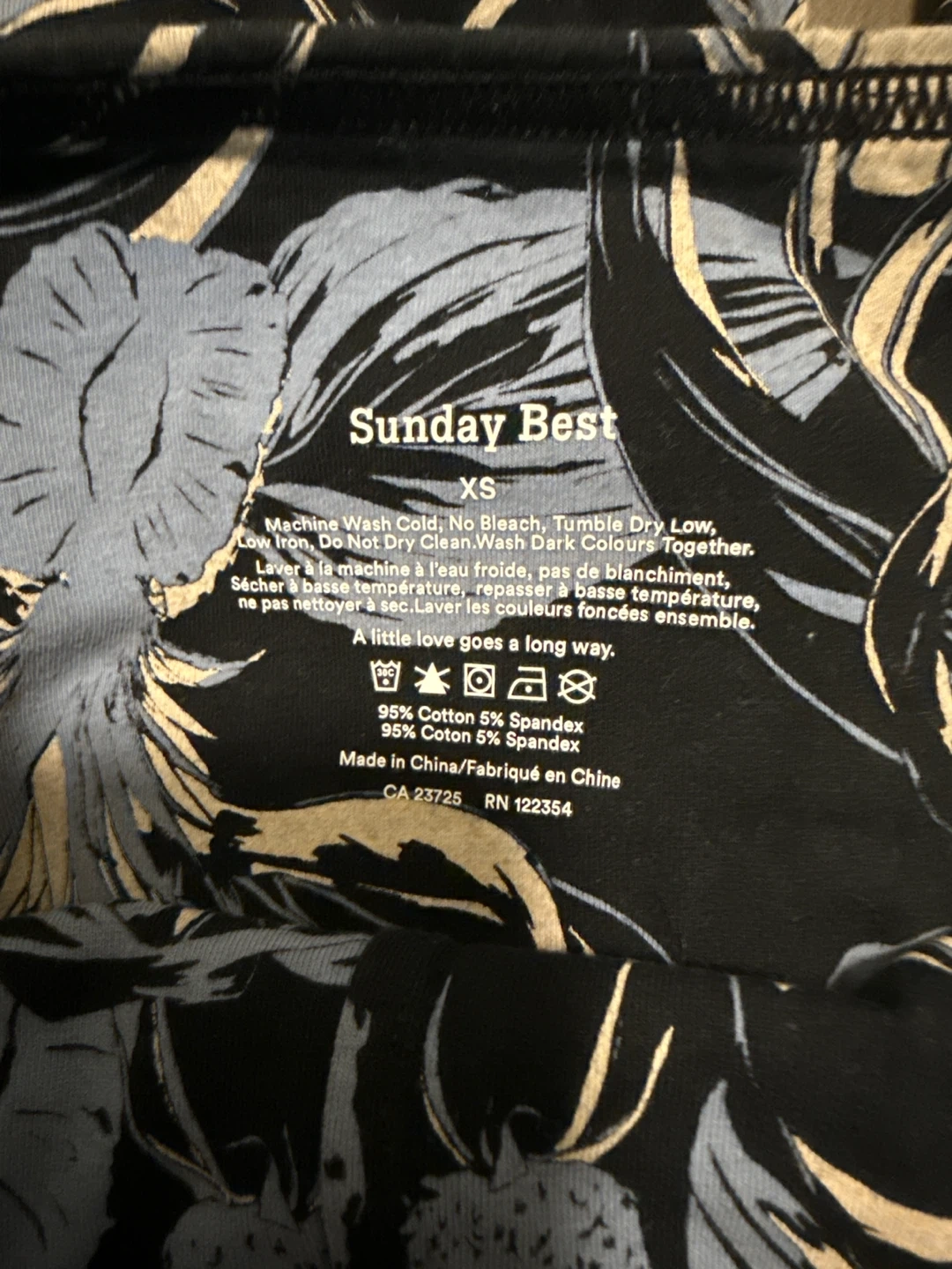 These Sunday Best leggings are in excellent condition and ready for a new home! They're a size XS and feature a lovely floral pattern in black, blue, and white. Made with 95% cotton and 5% spandex, they're super comfy too. Cash and pick up.