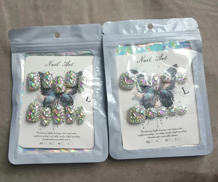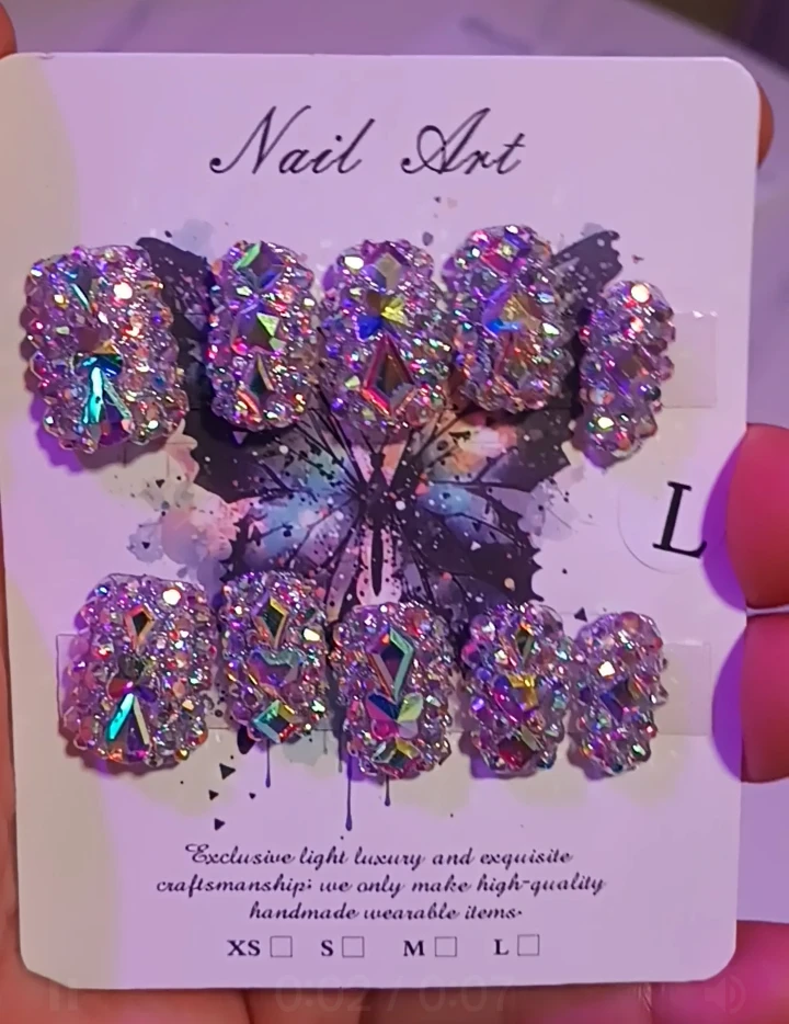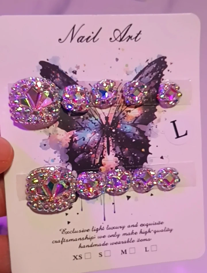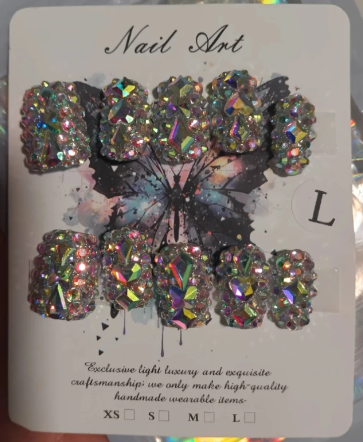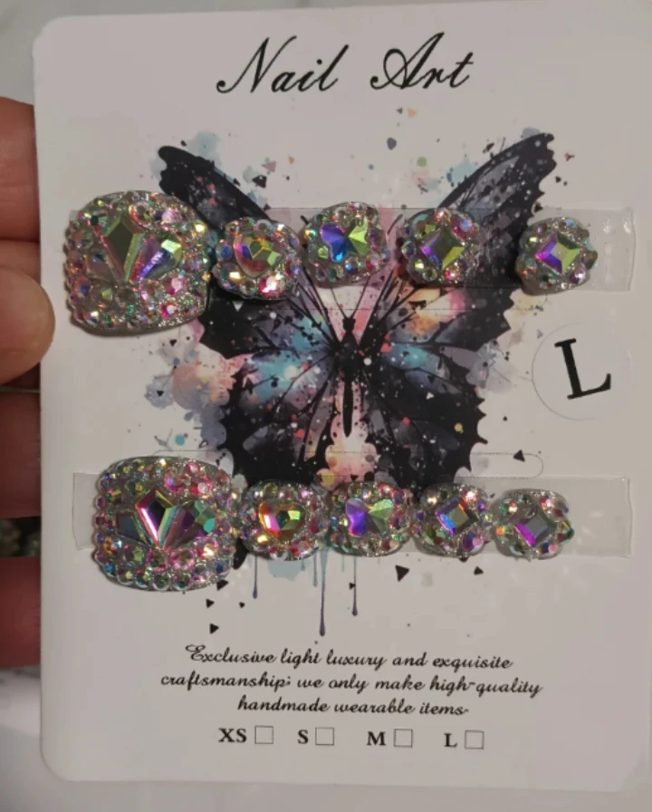Selling a set of beautiful rhinestone nail art in size L. These are handmade wearable items with an exclusive light luxury and exquisite craftsmanship. Comes with adhesive tabs and a mini nail file to help with application.You get the a set of nails and toes.