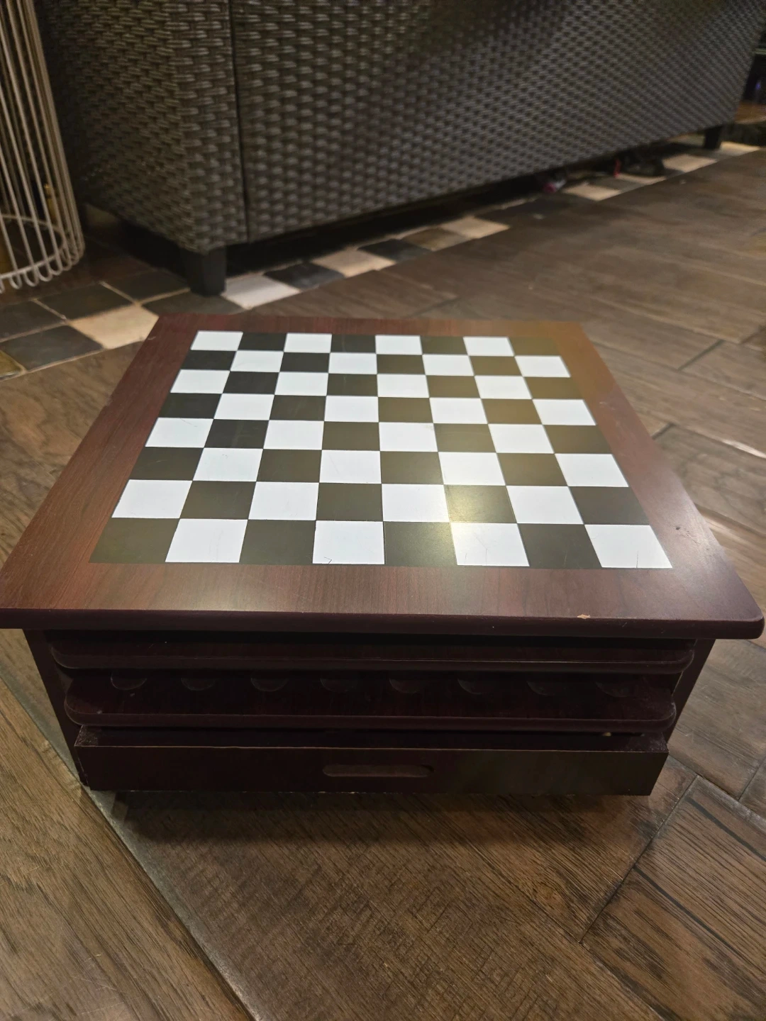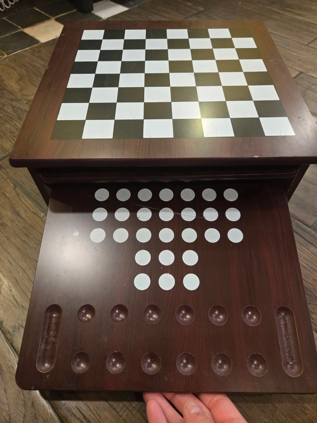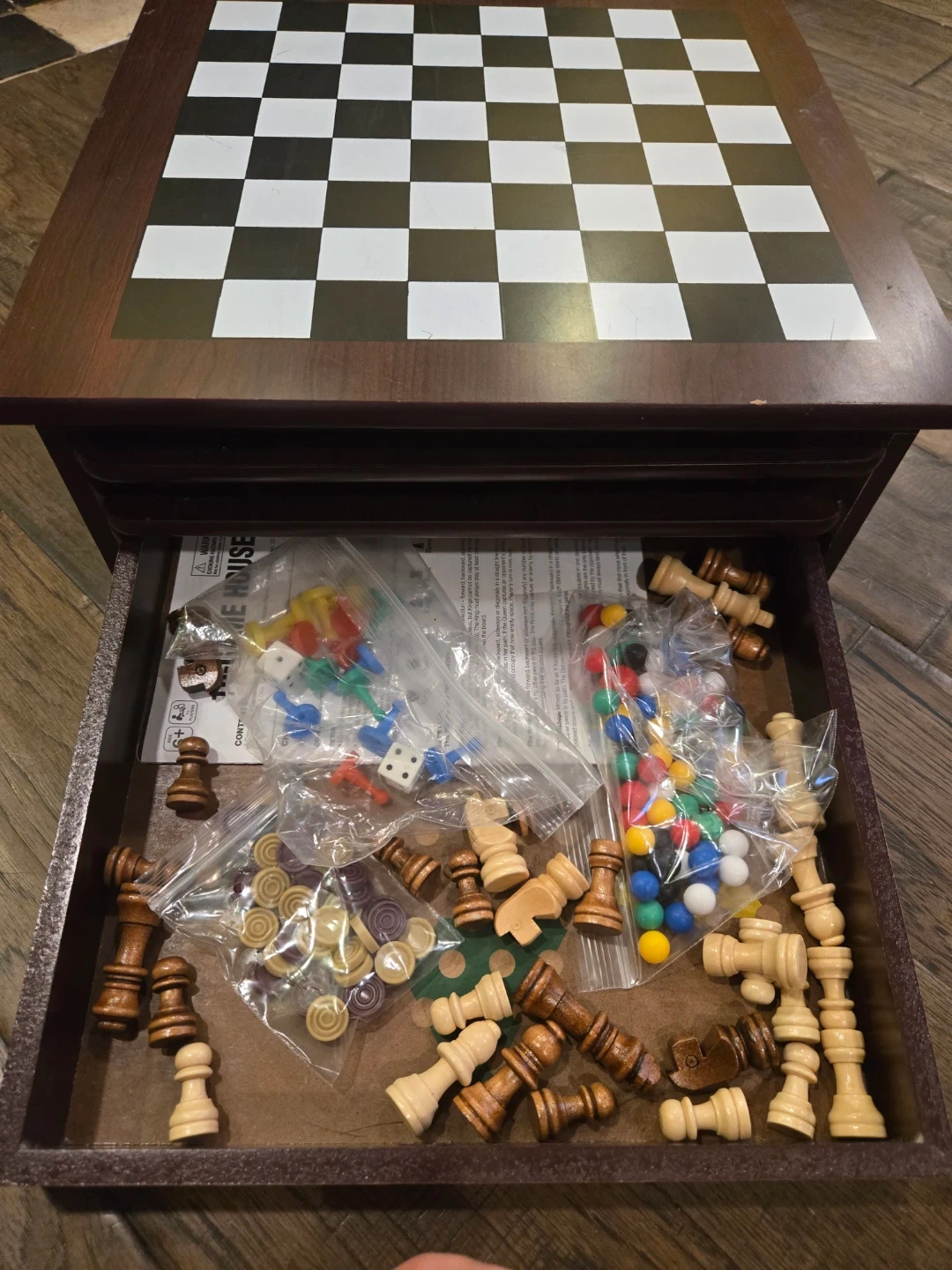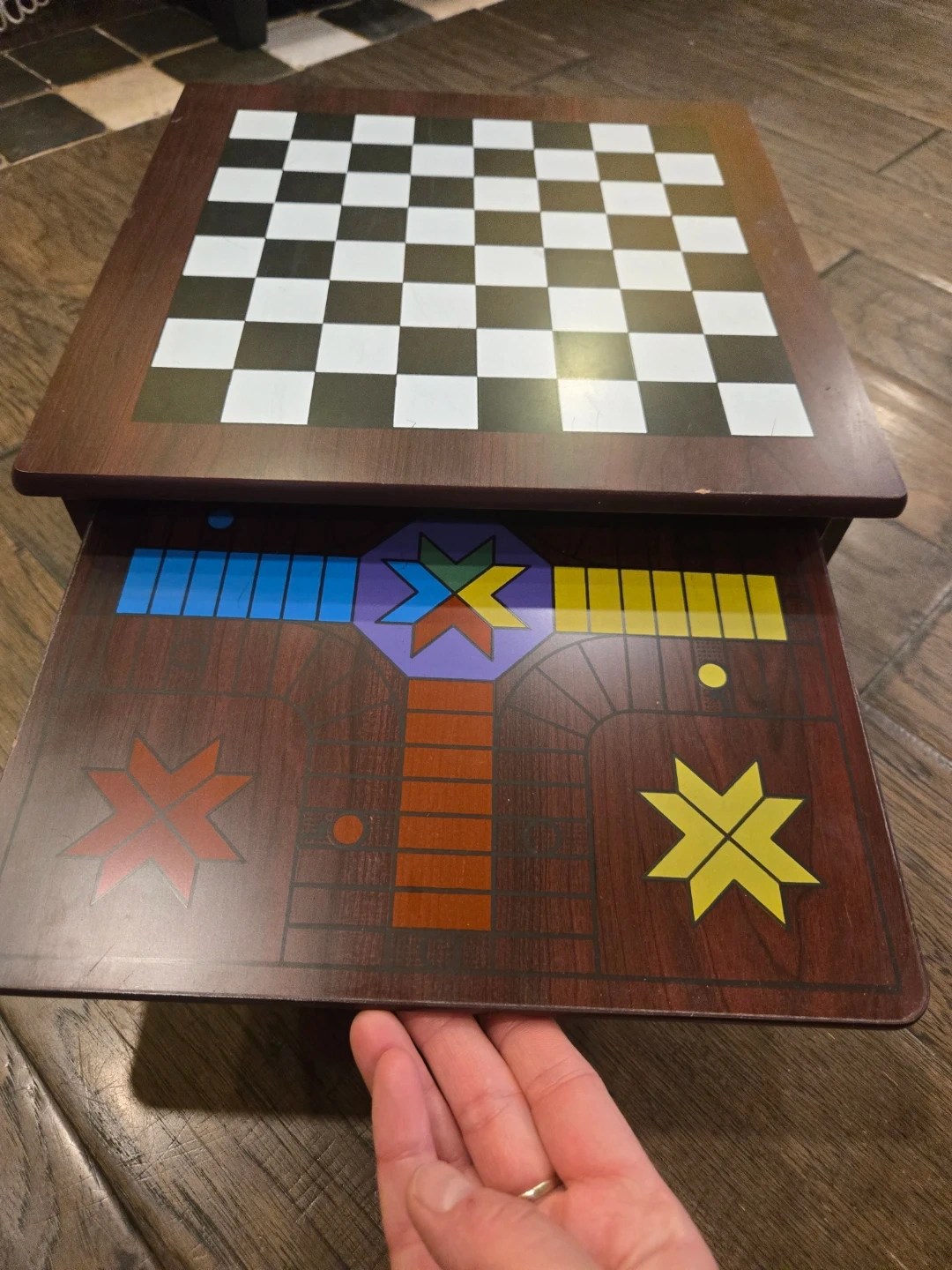 Selling a vintage game set that includes chess, checkers, and parcheesi! It comes with all the pieces and is in great condition. Perfect for family game nights or to add to your collection