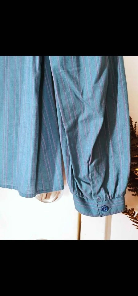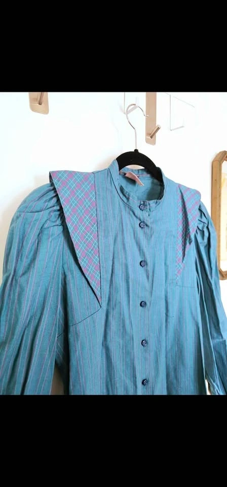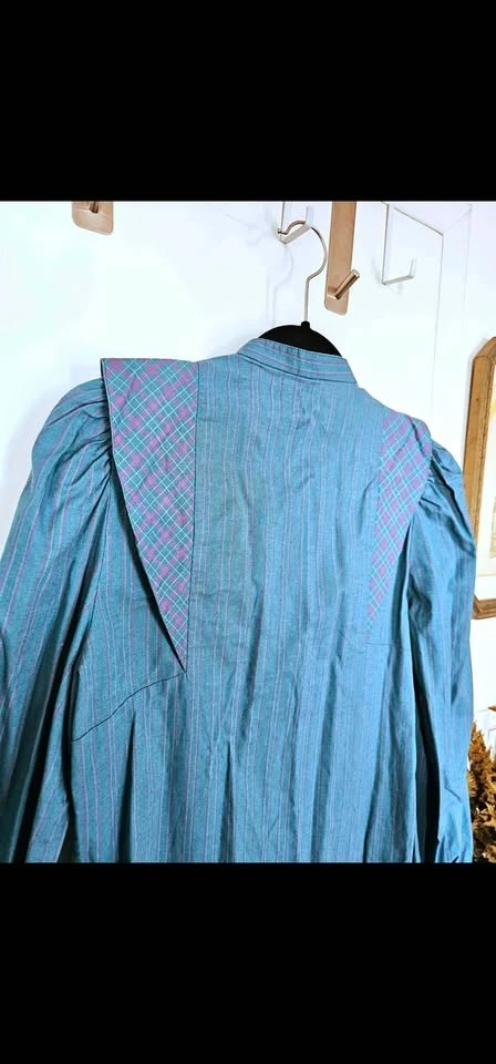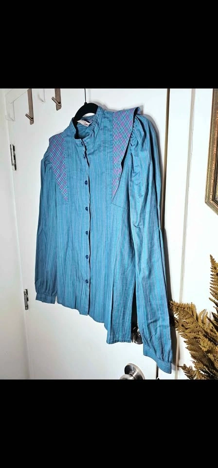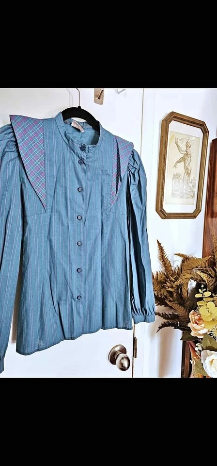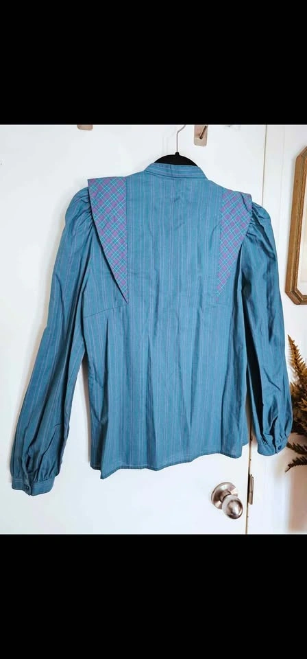 Charming vintage cotton prairie blouse, made in Finland in the late 1970s–early 1980s. Woven from high quality, crisp and breathable 100% cotton in a muted teal with purple accents. It has fine vertical stripes in rose pink/ purple and grey, and architectural statement shoulder yokes in a subtle matching plaid. Blouse has romantic puffed long sleeves, a simple stand collar, and a clean button front.