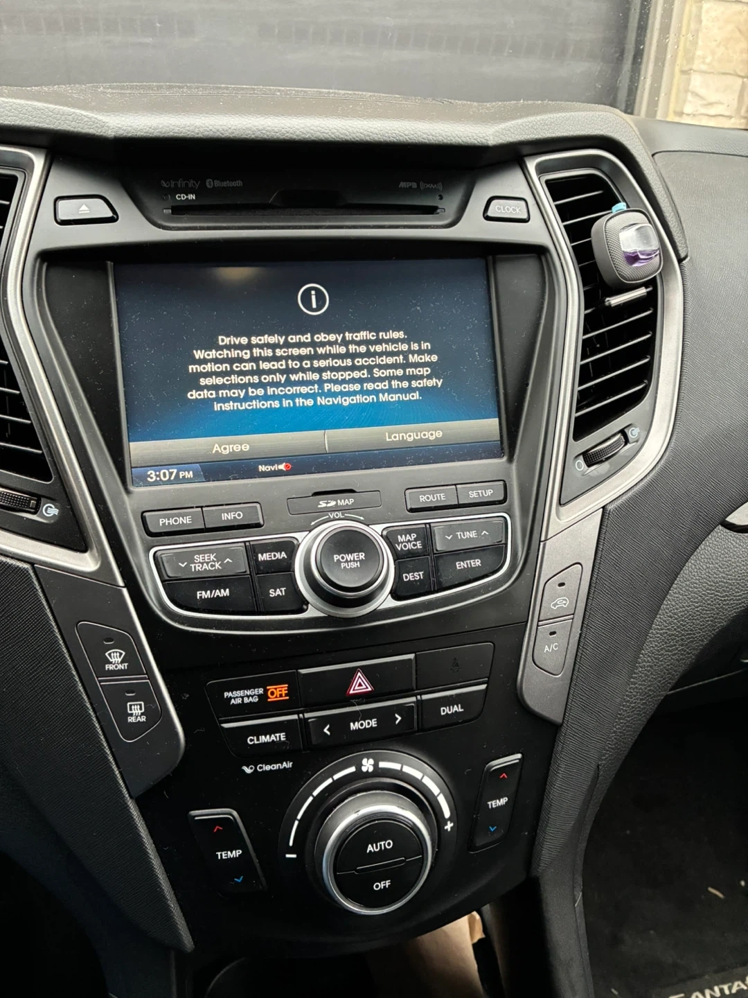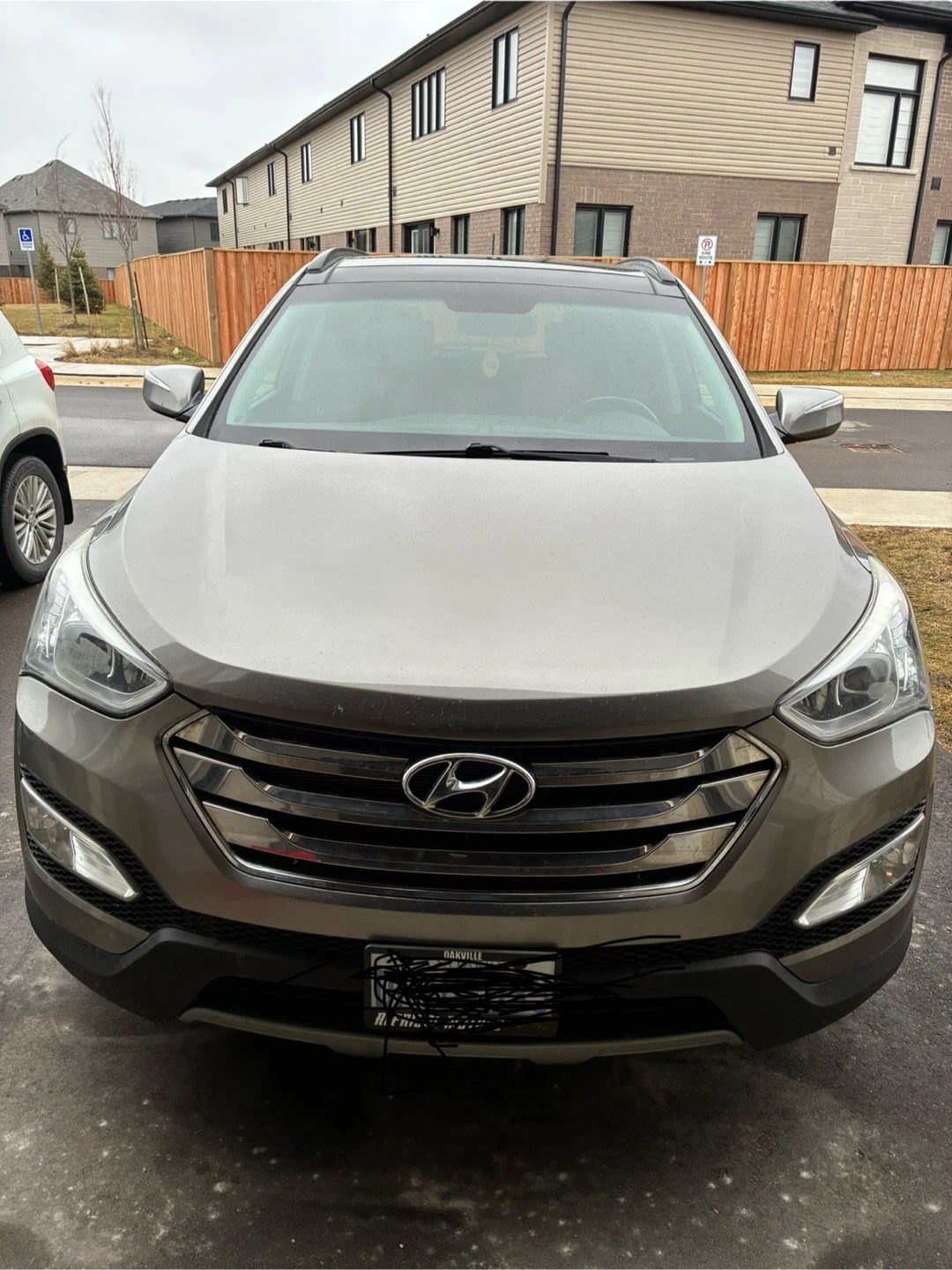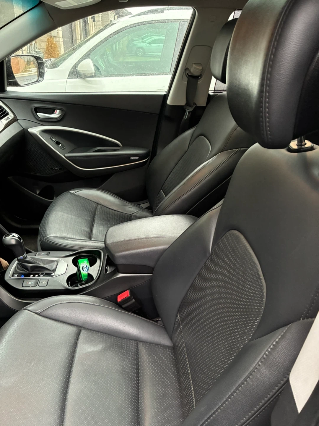 Selling a Hyundai Santa Fe SUV. It has a sunroof and black leather interior. The odometer reads 120211 km. The car also has navigation.