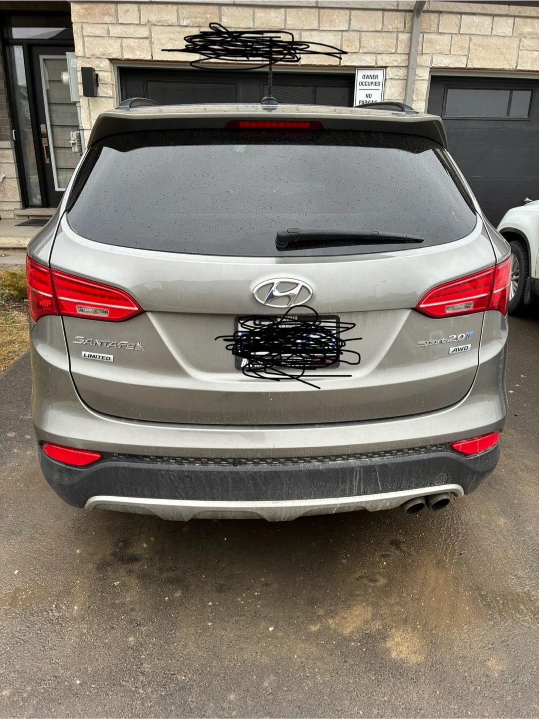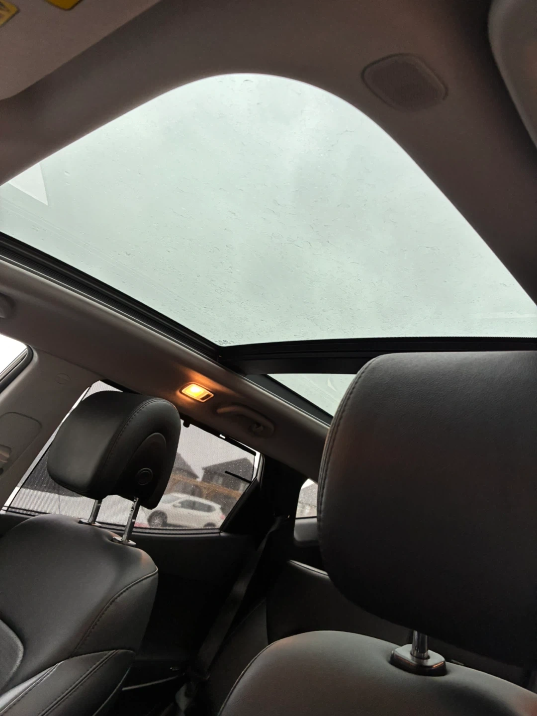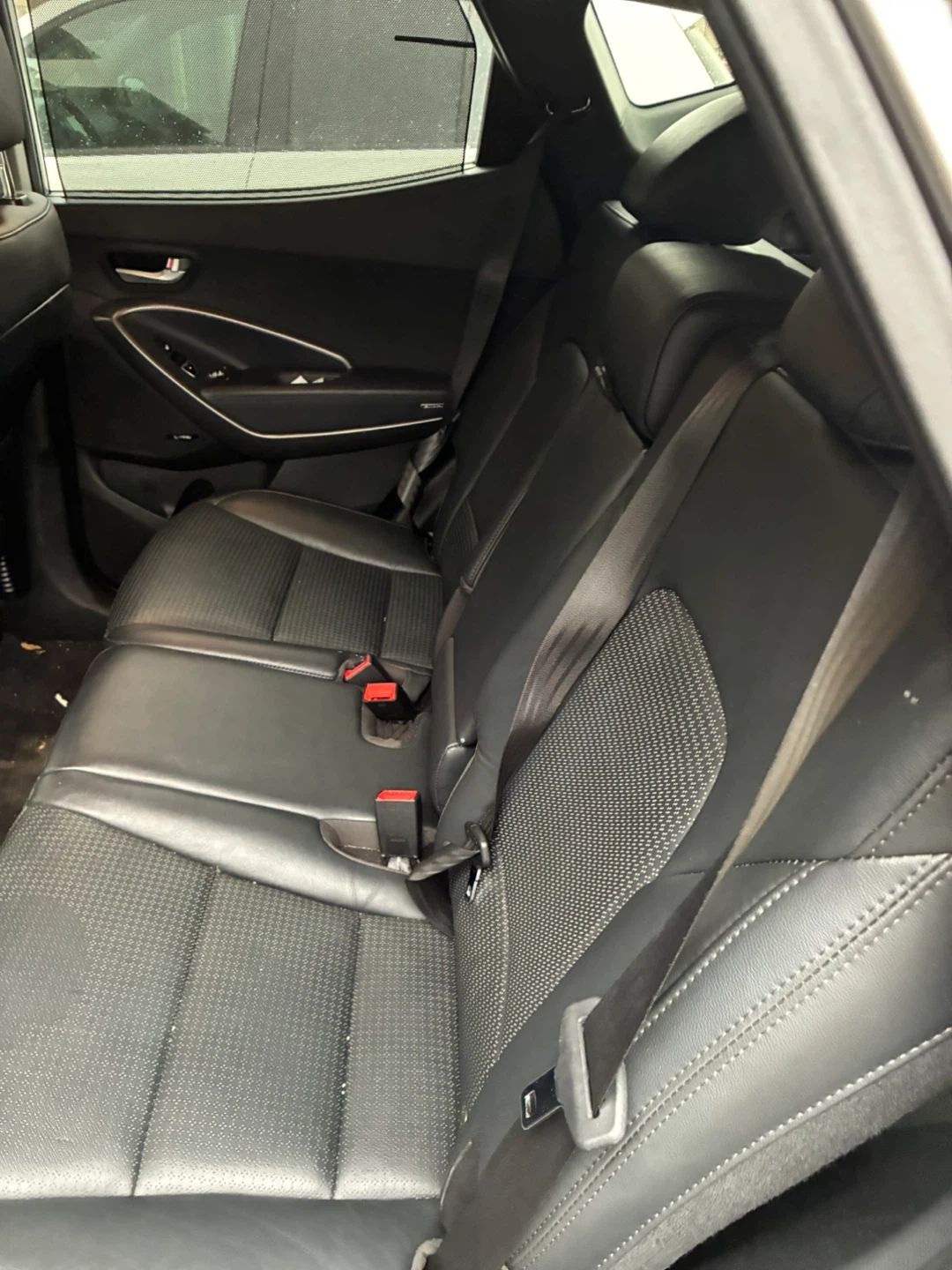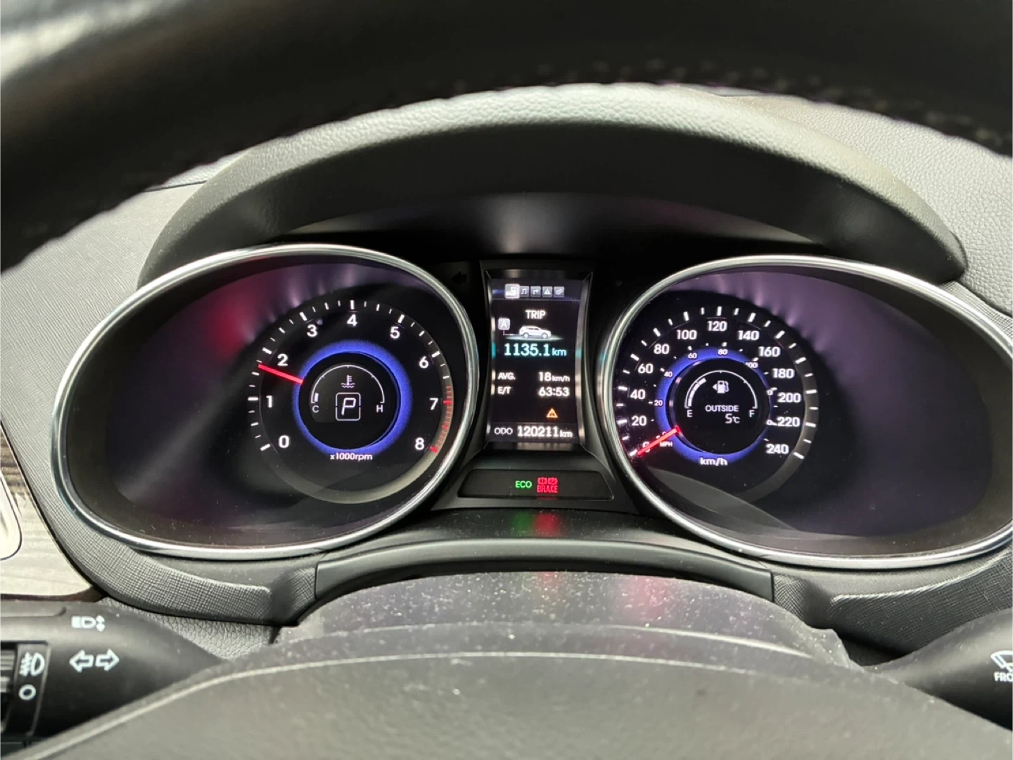 Selling a Hyundai Santa Fe SUV. It has a sunroof and black leather interior. The odometer reads 120211 km. The car also has navigation.