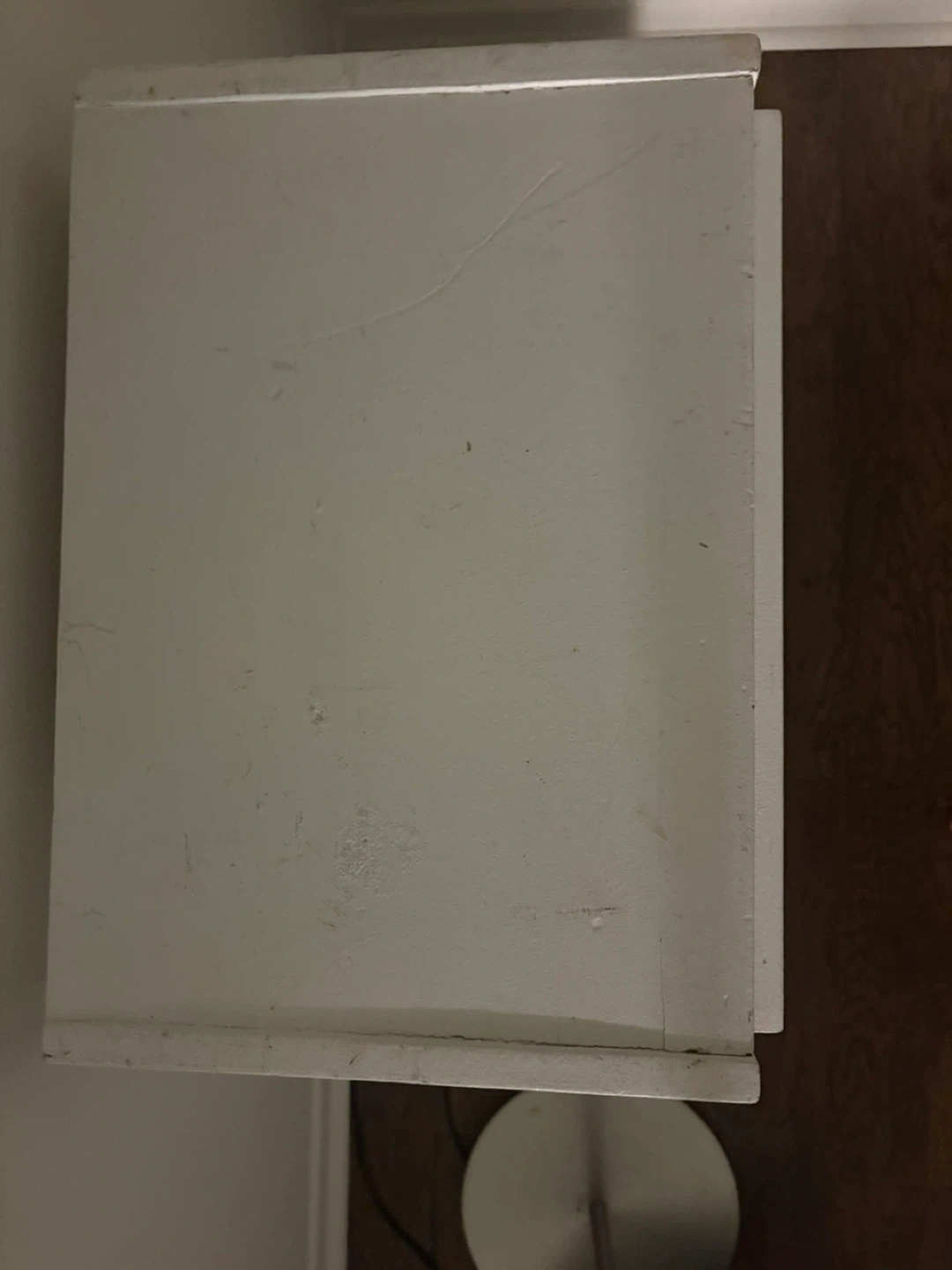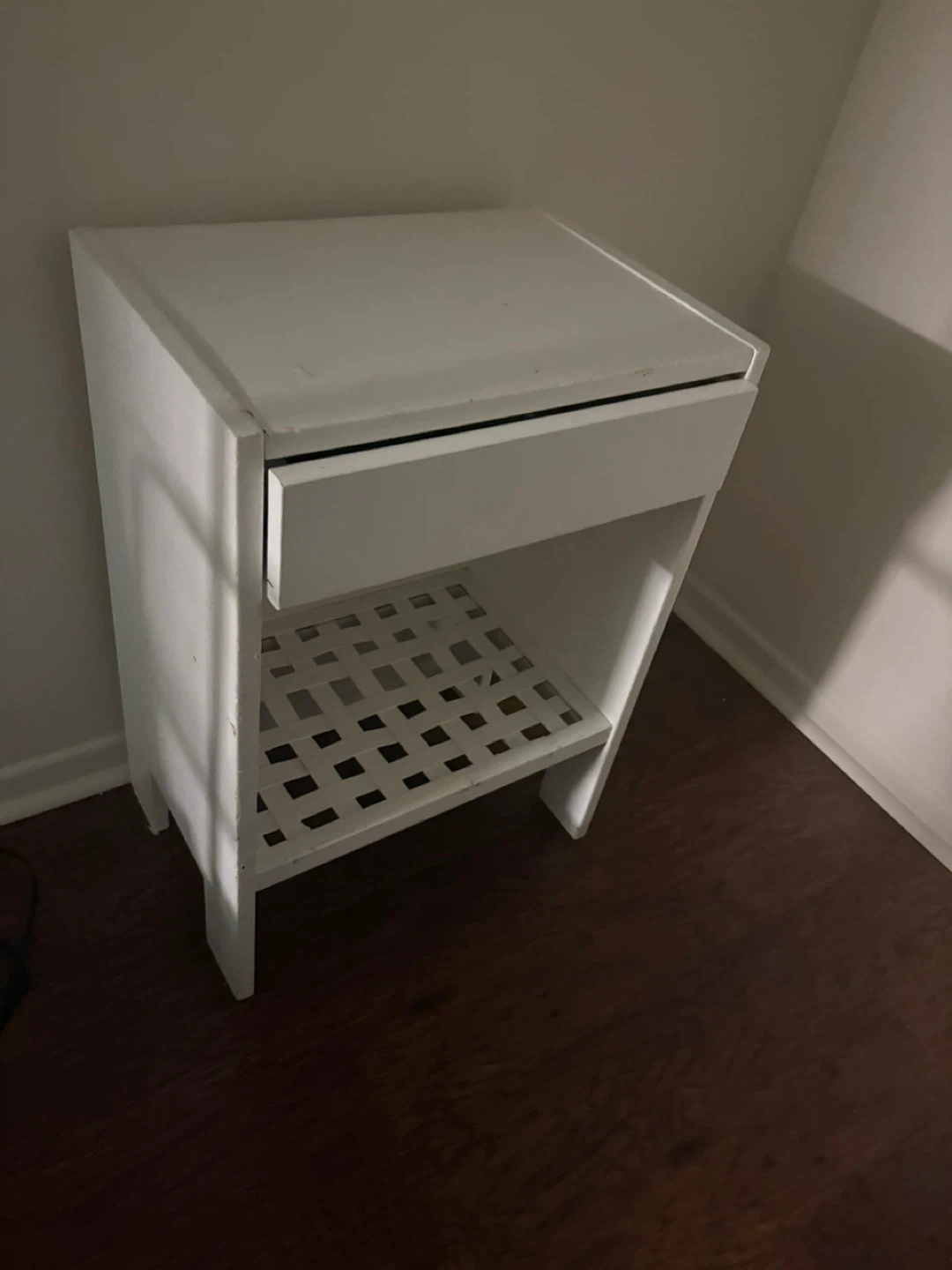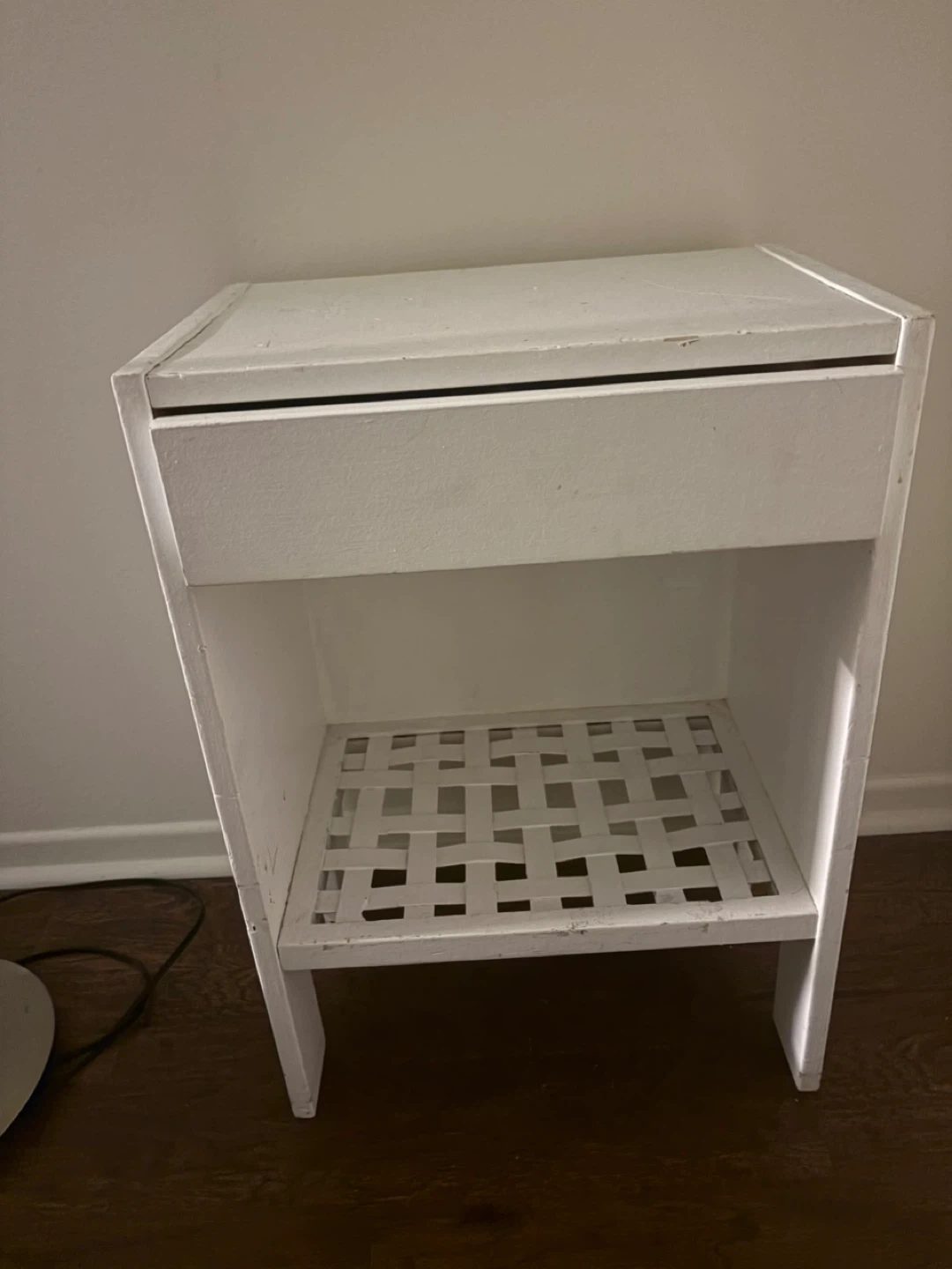 Selling a white wooden nightstand. It has a drawer and a shelf with a woven design. It's perfect for a bedside table or small storage unit.