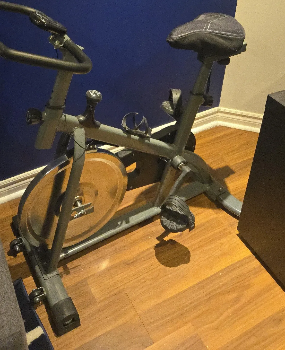 Selling a used exercise bike in good condition. It's perfect for getting a workout in at home. The bike is grey and features a water bottle holder for staying hydrated during your workout