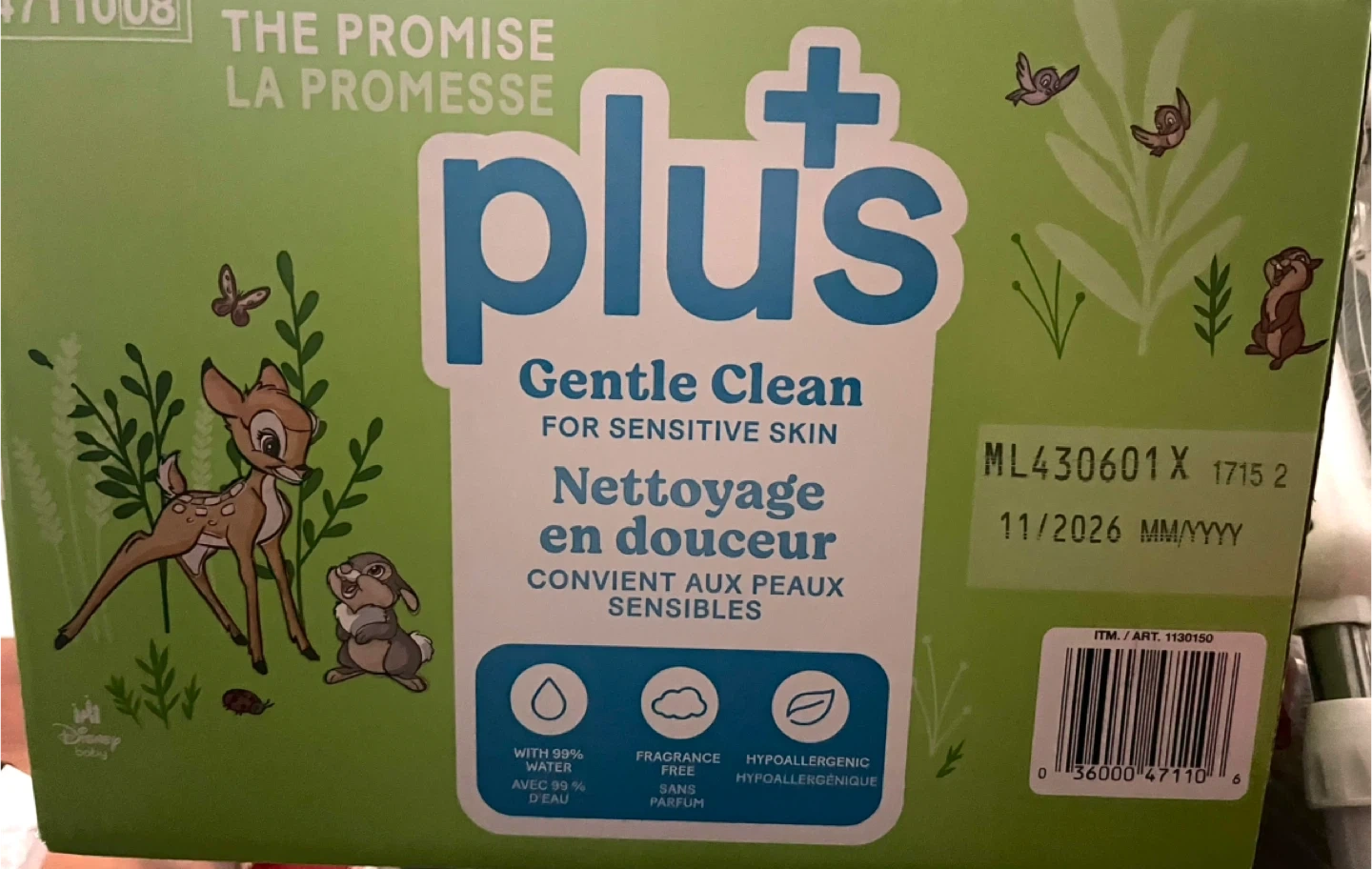 I'm selling a box of Huggies Plus+ Natural Care wipes. These gentle clean wipes are designed for sensitive skin and contain 99% purified water. They are hypoallergenic and fragrance-free. The box contains 1152 wipes. Expiry date is November 2026