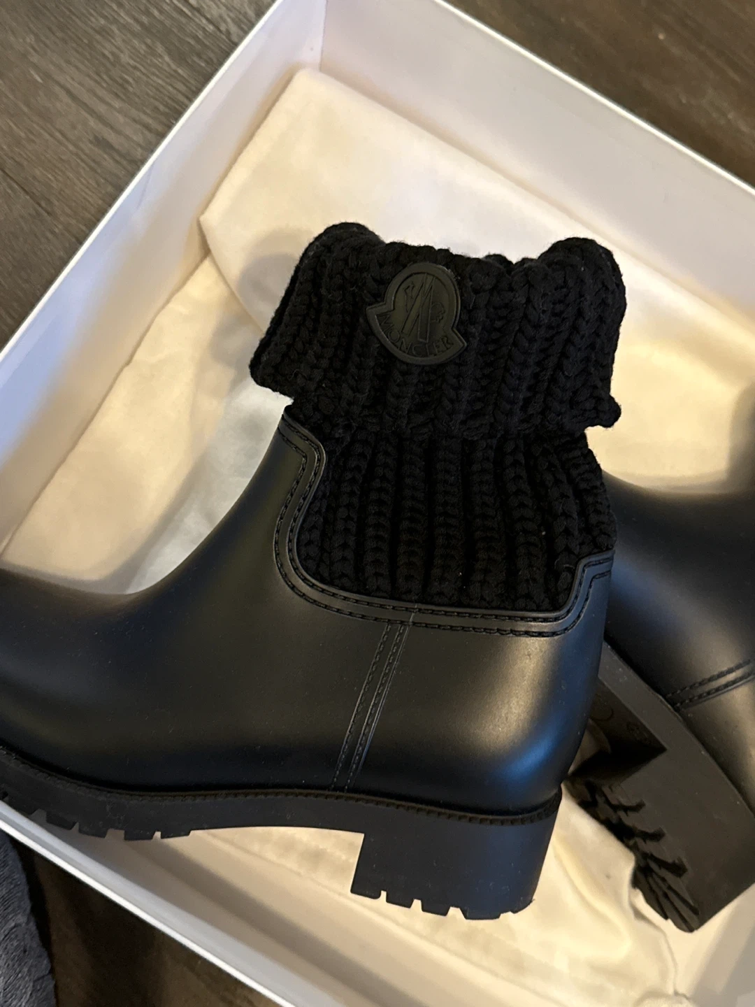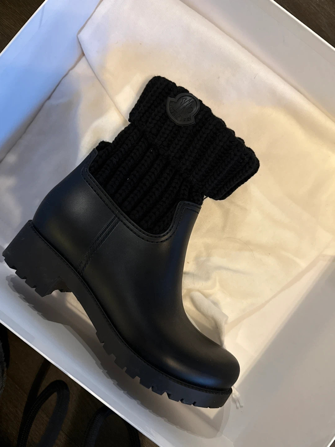 Selling a pair of Moncler Ginette Stivale boots in black. They are a size 36. The boots come with the original box and dust bag (retails $700)