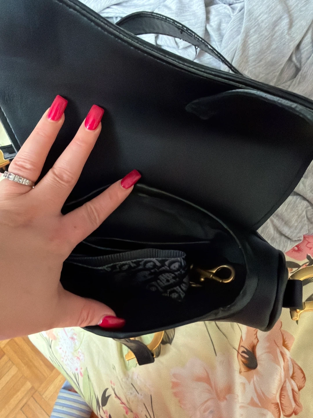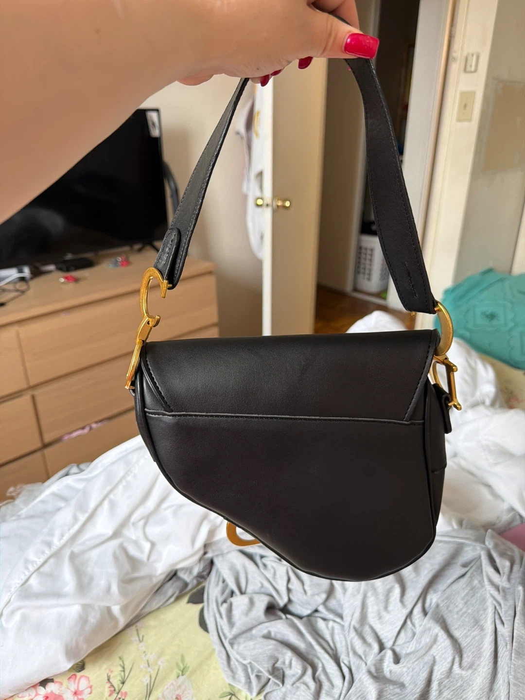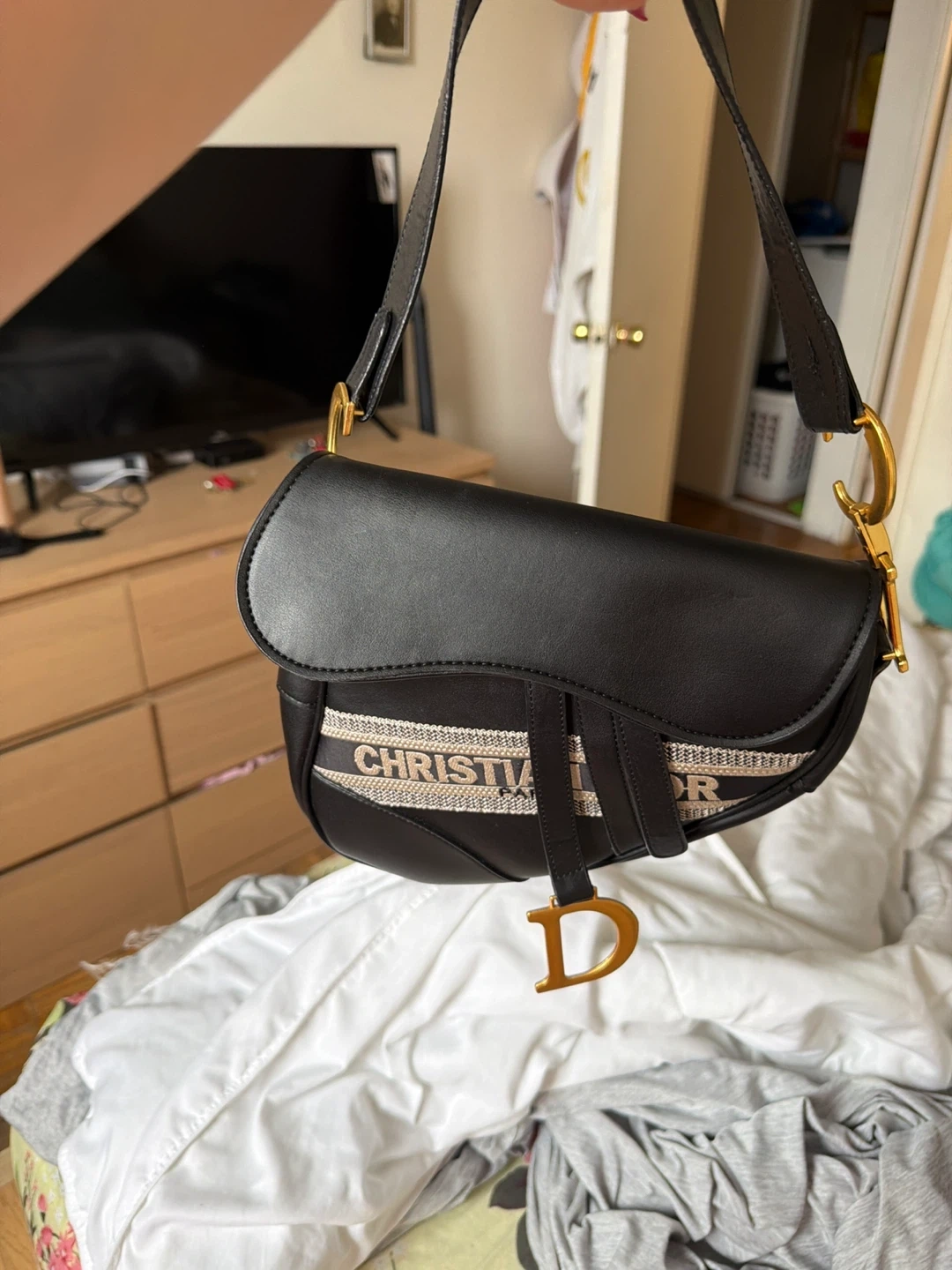 Selling a classic Dior Saddle Bag in black. It's in great condition and ready for a new owner. The bag features the iconic 'D' stirrup magnetic clasp and a saddle flap with the signature 'CD' structure on either side of the handle. It's a stylish and timeless piece to add to your collection