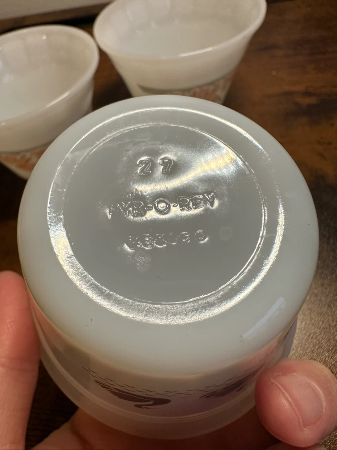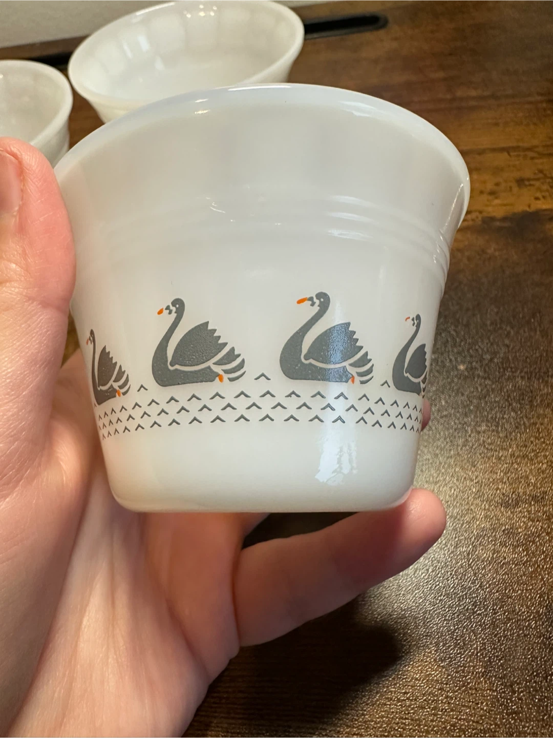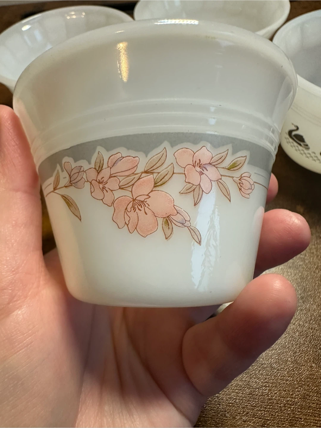There are three bowls with the pink flower design and one bowl with the swans. All four bowls are in great condition (albeit a bit dusty). No chips or cracks.